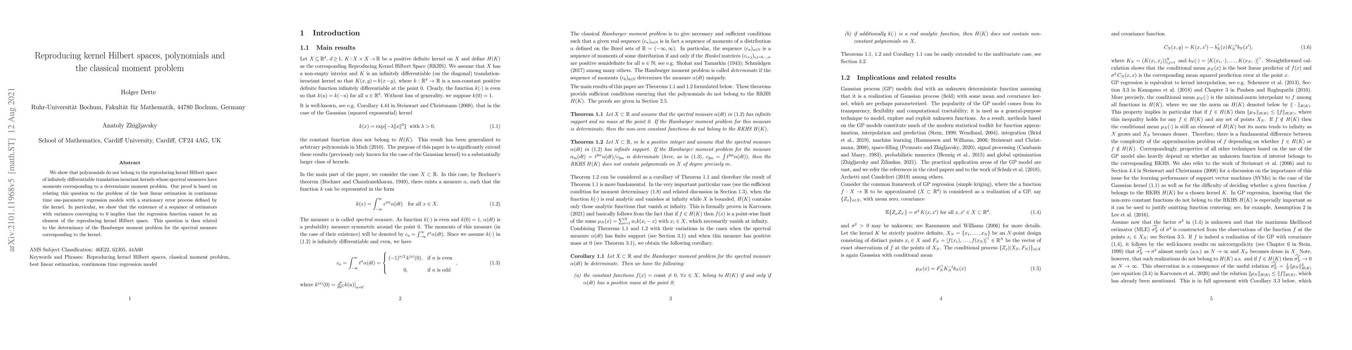 We show that polynomials do not belong to the reproducing kernel Hilbert space of infinitely differentiable translation-invariant kernels whose spectral measures have moments corresponding to a determinate moment problem. Our proof is based on relating this question to the problem of best linear estimation in continuous time one-parameter regression models with a stationary error process defined by the kernel. In particular, we show that the existence of a sequence of estimators with variances converging to $0$ implies that the regression function cannot be an element of the reproducing kernel Hilbert space. This question is then related to the determinacy of the Hamburger moment problem for the spectral measure corresponding to the kernel. In the literature it was observed that a non-vanishing constant function does not belong to the reproducing kernel Hilbert space associated with the Gaussian kernel (see Corollary 4.44 in Steinwart and Christmann, 2008). Our results provide a unifying view of this phenomenon and show that the mentioned result can be extended for arbitrary polynomials and a broad class of translation-invariant kernels.