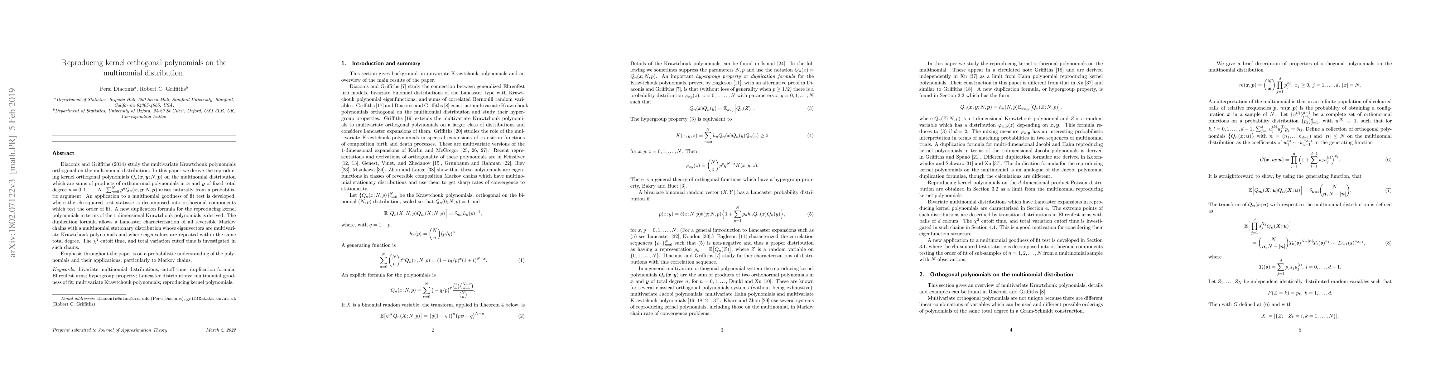 This paper derives reproducing kernel orthogonal polynomials on the multinomial distribution, extending the multivariate Krawtchouk polynomials. It introduces a new duplication formula and applies these polynomials to decompose a chi-squared test statistic for multinomial goodness of fit, exploring their implications in reversible Markov chains.