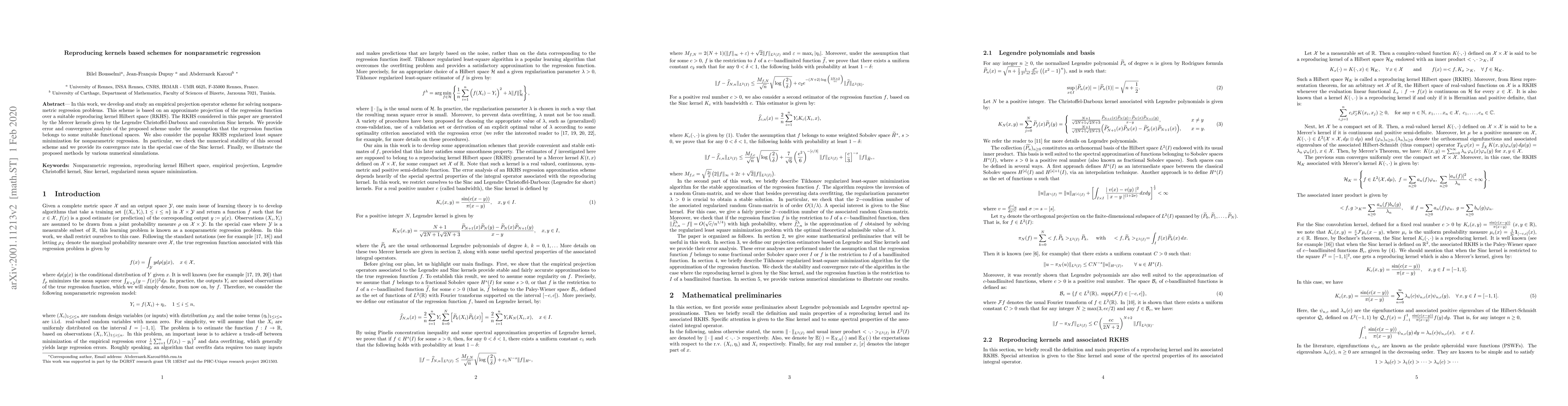 In this work, we develop and study an empirical projection operator scheme for solving nonparametric regression problems. This scheme is based on an approximate projection of the regression function over a suitable reproducing kernel Hilbert space (RKHS). The RKHS considered in this paper are generated by the Mercer kernels given by the Legendre Christoffel-Darboux and convolution Sinc kernels. We provide error and convergence analysis of the proposed scheme under the assumption that the regression function belongs to some suitable functional spaces. We also consider the popular RKHS regularized least square minimization for nonparametric regression. In particular, we check the numerical stability of this second scheme and we provide its convergence rate in the special case of the Sinc kernel. Finally, we illustrate the proposed methods by various numerical simulation.