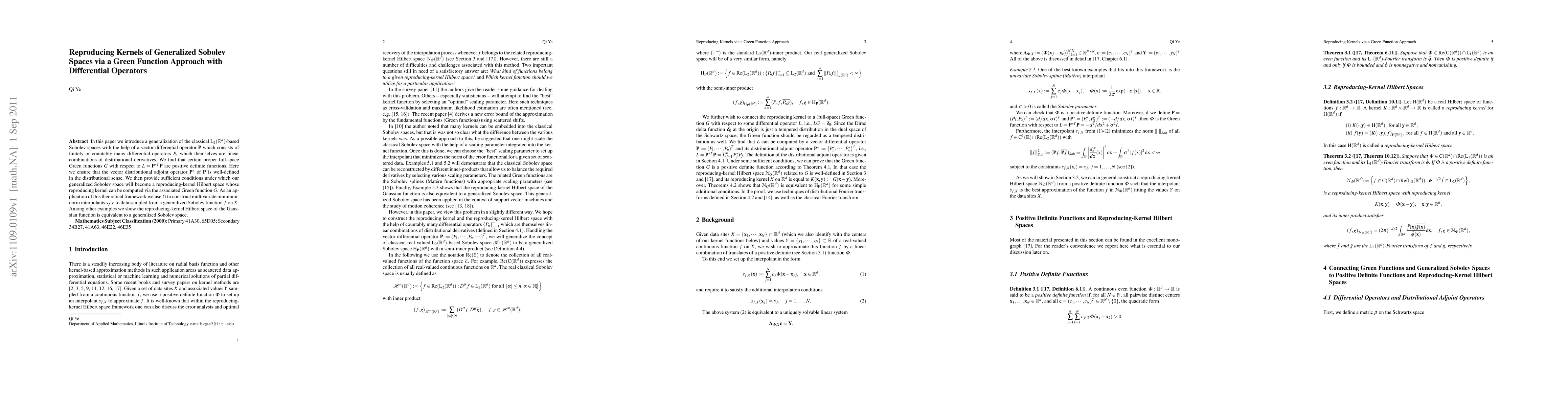In this paper we introduce a generalization of the classical $\Leb_2(\Rd)$-based Sobolev spaces with the help of a vector differential operator $\mathbf{P}$ which consists of finitely or countably many differential operators $P_n$ which themselves are linear combinations of distributional derivatives. We find that certain proper full-space Green functions $G$ with respect to $L=\mathbf{P}^{\ast T}\mathbf{P}$ are positive definite functions. Here we ensure that the vector distributional adjoint operator $\mathbf{P}^{\ast}$ of $\mathbf{P}$ is well-defined in the distributional sense. We then provide sufficient conditions under which our generalized Sobolev space will become a reproducing-kernel Hilbert space whose reproducing kernel can be computed via the associated Green function $G$. As an application of this theoretical framework we use $G$ to construct multivariate minimum-norm interpolants $s_{f,X}$ to data sampled from a generalized Sobolev function $f$ on $X$. Among other examples we show the reproducing-kernel Hilbert space of the Gaussian function is equivalent to a generalized Sobolev space.