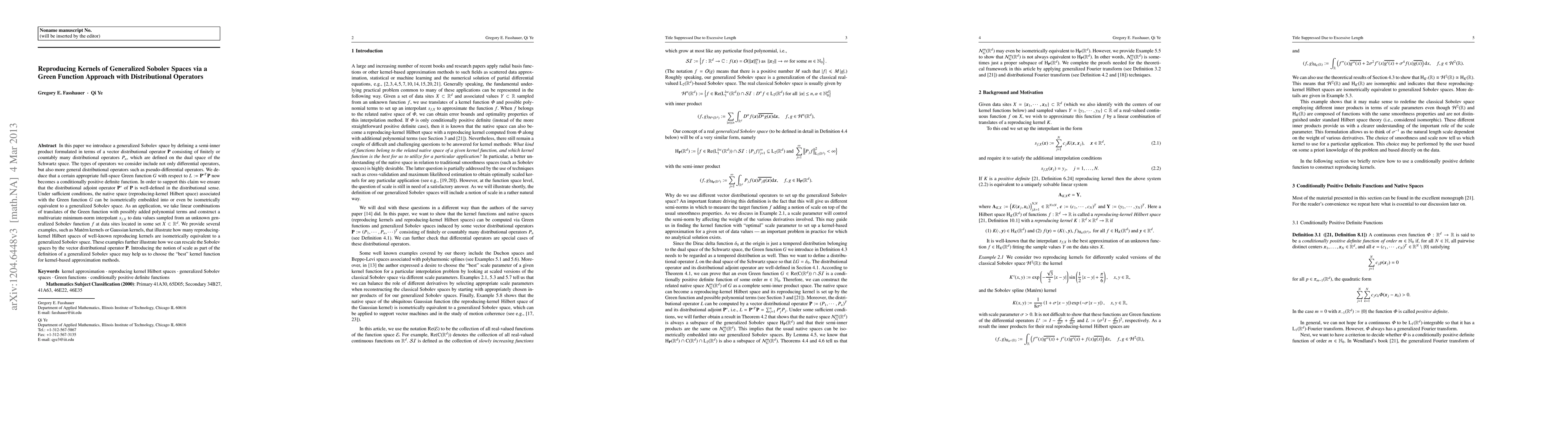 Researchers introduce a new generalized Sobolev space based on distributional operators, which can reproduce kernels of well-known reproducing kernel Hilbert spaces via a Green function, offering a scalable approach to choosing optimal kernel functions.