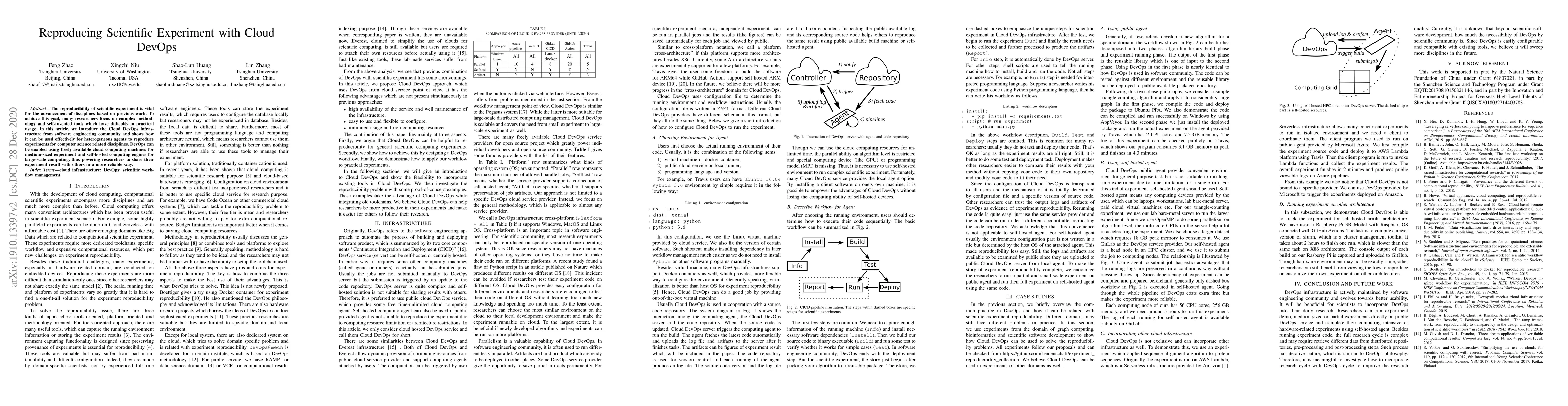 The reproducibility of scientific experiment is vital for the advancement of disciplines based on previous work. To achieve this goal, many researchers focus on complex methodology and self-invented tools which have difficulty in practical usage. In this article, we introduce the Cloud DevOps infrastructure from software engineering community and shows how it can be used effectively for heterogeneous agents to reproduce experiments for computer science related disciplines. DevOps can be enabled using freely available cloud computing machines for medium-sized experiment and self-hosted computing engines for large-scale computing, thus powering researchers to share their experiment result with others in a more reliable way.