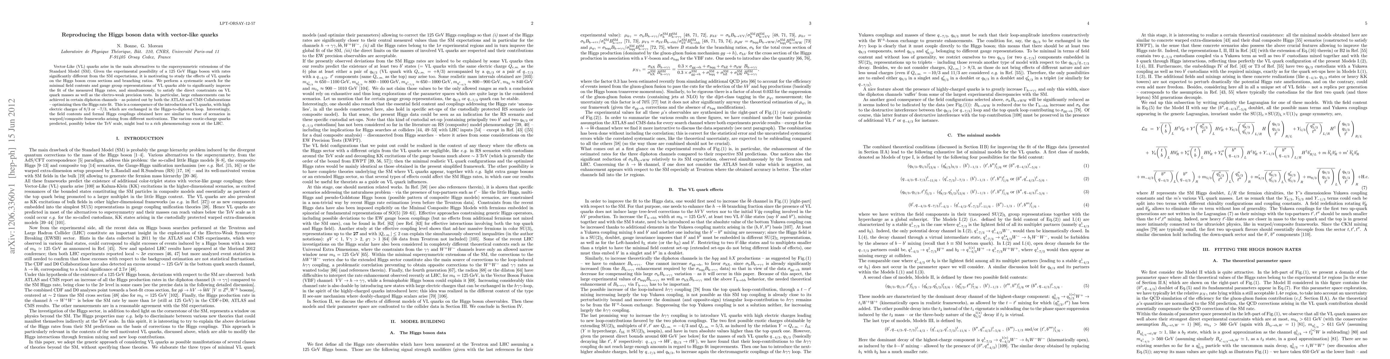 Vector-Like (VL) quarks arise in the main alternatives to the supersymmetric extensions of the Standard Model (SM). Given the experimental possibility of a 125 GeV Higgs boson with rates significantly different from the SM expectations, it is motivating to study the effects of VL quarks on the Higgs boson cross sections and branching ratios. We perform a systematic search for the minimal field contents and gauge group representations of VL quarks able to significantly improve the fit of the measured Higgs rates, and simultaneously, to satisfy the direct constraints on VL quark masses as well as the electro-weak precision tests. In particular, large enhancements can be achieved in certain diphoton channels - as pointed out by both the ATLAS and CMS Collaborations - optimizing then the Higgs rate fit. This is a consequence of the introduction of VL quarks, with high electric charges of 8/3 or -7/3, which are exchanged in the Higgs-to-diphoton loop. Interestingly, the field contents and formal Higgs couplings obtained here are similar to those of scenarios in warped/composite frameworks arising from different motivations. The various exotic-charge quarks predicted, possibly below the TeV scale, might lead to a rich phenomenology soon at the LHC.