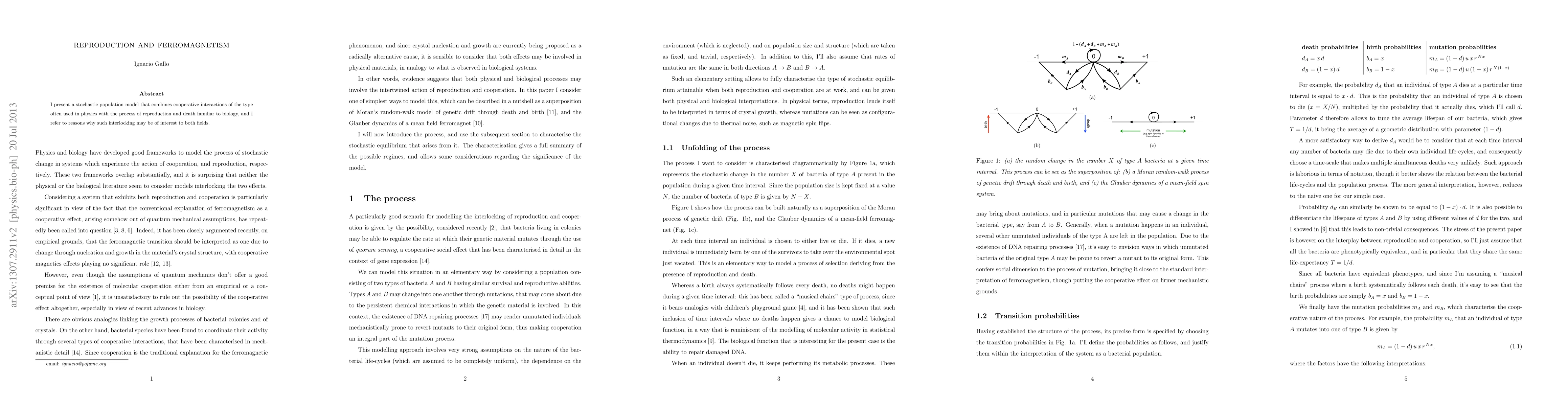 I present a stochastic population model that combines cooperative interactions of the type often used in physics with the process of reproduction and death familiar to biology, and I refer to reasons why such interlocking may be of interest to both fields.