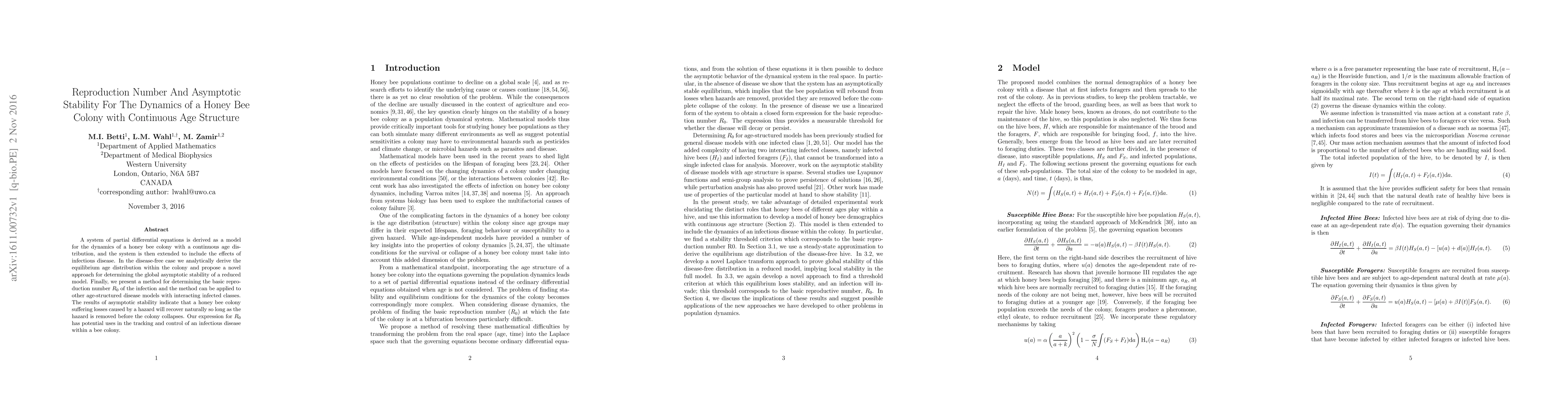 This paper models the dynamics of a honey bee colony with continuous age structure using partial differential equations, extending the model to include infectious disease. It determines the basic reproduction number $R_0$ and proves global asymptotic stability, indicating that a colony can recover if losses are addressed before collapse.