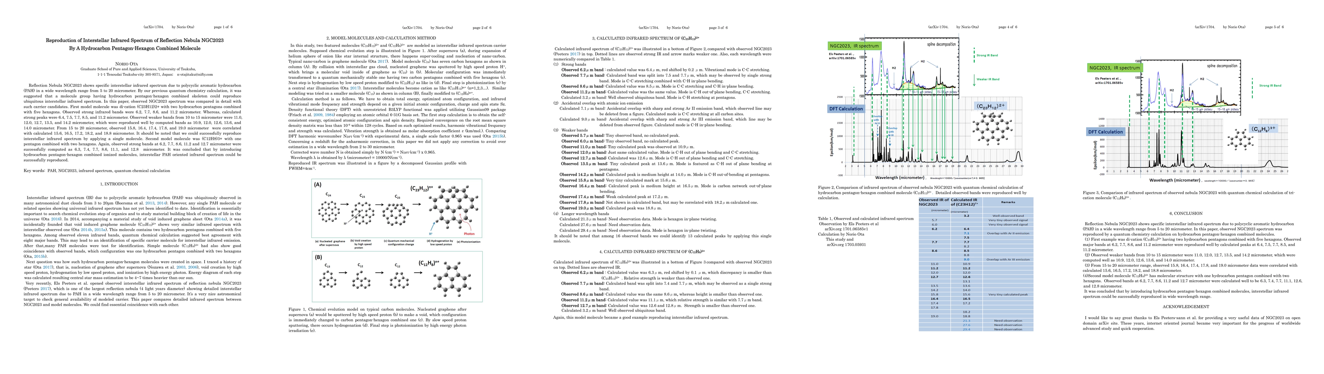 Reflection Nebula NGC2023 shows specific interstellar infrared spectrum due to polycyclic aromatic hydrocarbon (PAH) in a wide wavelength range from 5 to 20 micrometer. By our previous quantum chemistry calculation, it was suggested that a molecule group having hydrocarbon pentagon-hexagon combined skeleton could reproduce ubiquitous interstellar infrared spectrum. In this paper, observed NGC2023 spectrum was compared in detail with such carrier candidates. First model molecule was di-cation (C23H12)2+ with two hydrocarbon pentagons combined with five hexagons. Observed strong infrared bands were 6.2, 7.7, 8.6, and 11.2 micrometer. Whereas, calculated strong peaks were 6.4, 7.5, 7.7, 8.5, and 11.2 micrometer. Observed weaker bands from 10 to 15 micrometer were 11.0, 12.0, 12.7, 13.5, and 14.2 micrometer, which were reproduced well by computed bands as 10.9, 12.0, 12.6, 13.6, and 14.0 micrometer. From 15 to 20 micrometer, observed 15.8, 16.4, 17.4, 17.8, and 19.0 micrometer were correlated with calculated 15.6, 16.5, 17.2, 18.2, and 18.8 micrometer. It should be noted that we could successfully reproduce interstellar infrared spectrum by applying a single molecule. Second model molecule was (C12H8)3+ with one pentagon combined with two hexagons. Again, observed strong bands at 6.2, 7.7, 8.6, 11.2 and 12.7 micrometer were successfully computed as 6.3, 7.4, 7.7, 8.6, 11.1, and 12.8 micrometer. It was concluded that by introducing hydrocarbon pentagon-hexagon combined ionized molecules, interstellar PAH oriented infrared spectrum could be successfully reproduced.