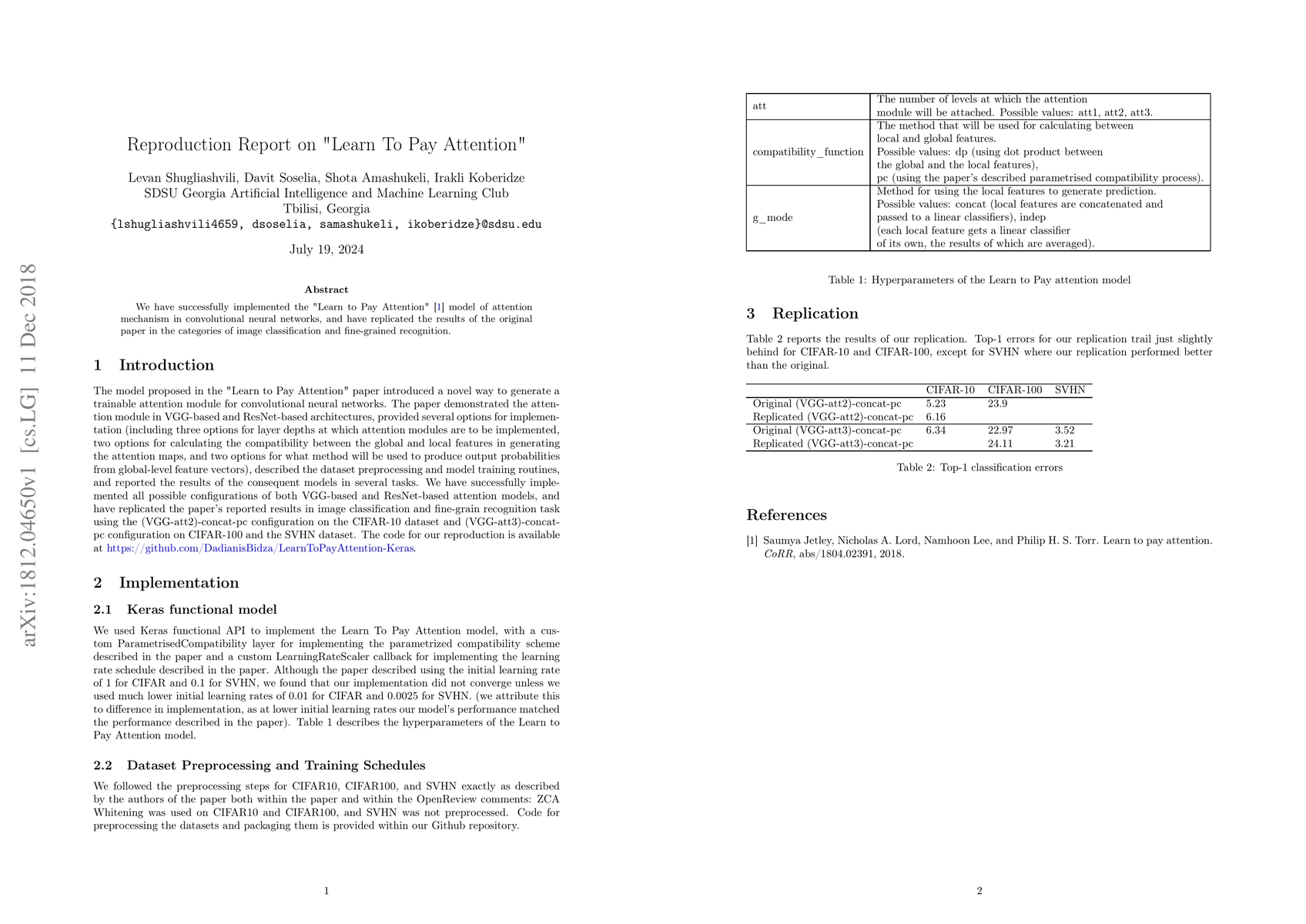 Summary: The "Learn to Pay Attention" attention mechanism in convolutional neural networks was successfully implemented, replicating original results in image classification and fine-grained recognition tasks. This demonstrates the model's effectiveness across different applications.