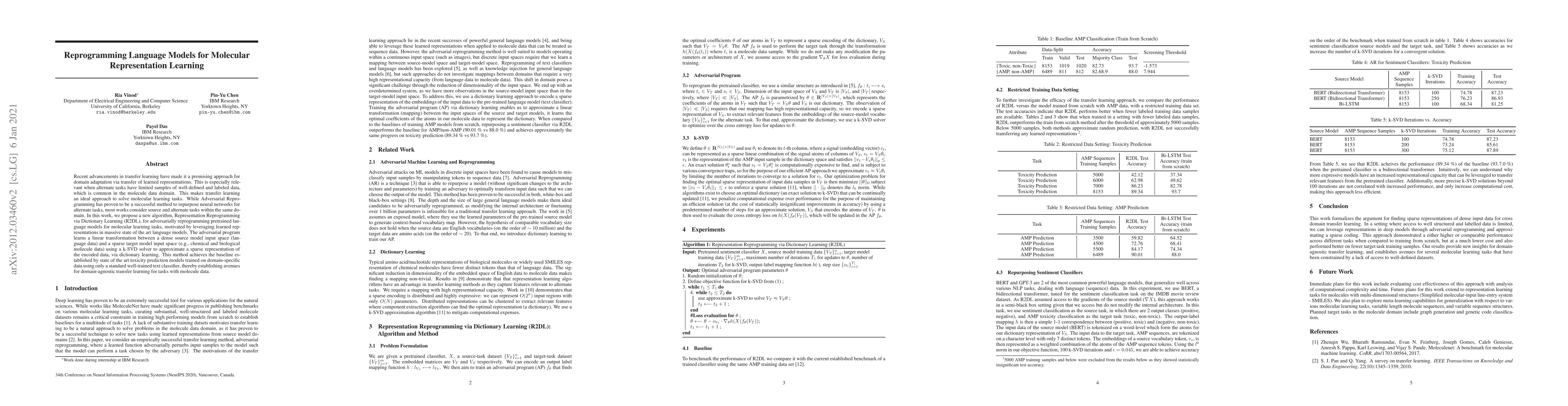 This paper proposes a new algorithm, Representation Reprogramming via Dictionary Learning (R2DL), to adversarially reprogram pretrained language models for molecular learning tasks. R2DL leverages learned representations from large language models and achieves competitive performance on toxicity prediction, even with limited training data, demonstrating the potential of domain-agnostic transfer learning for molecular data.