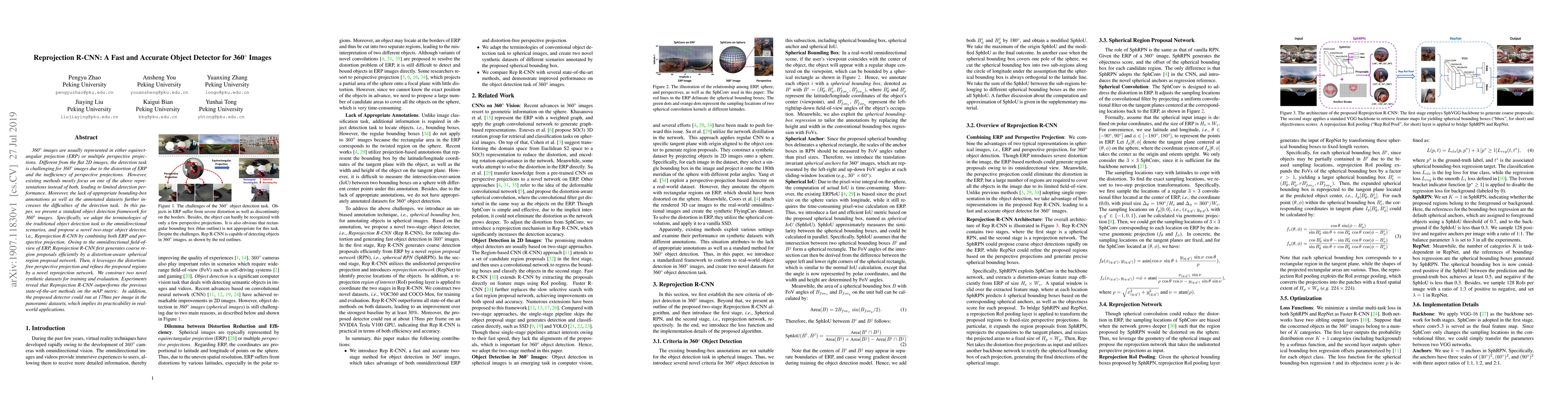 Reprojection R-CNN is a novel two-stage object detector for 360° images, combining equirectangular projection and perspective projection to address detection challenges. It achieves high accuracy and efficiency, outperforming previous methods and running at 178ms per image.