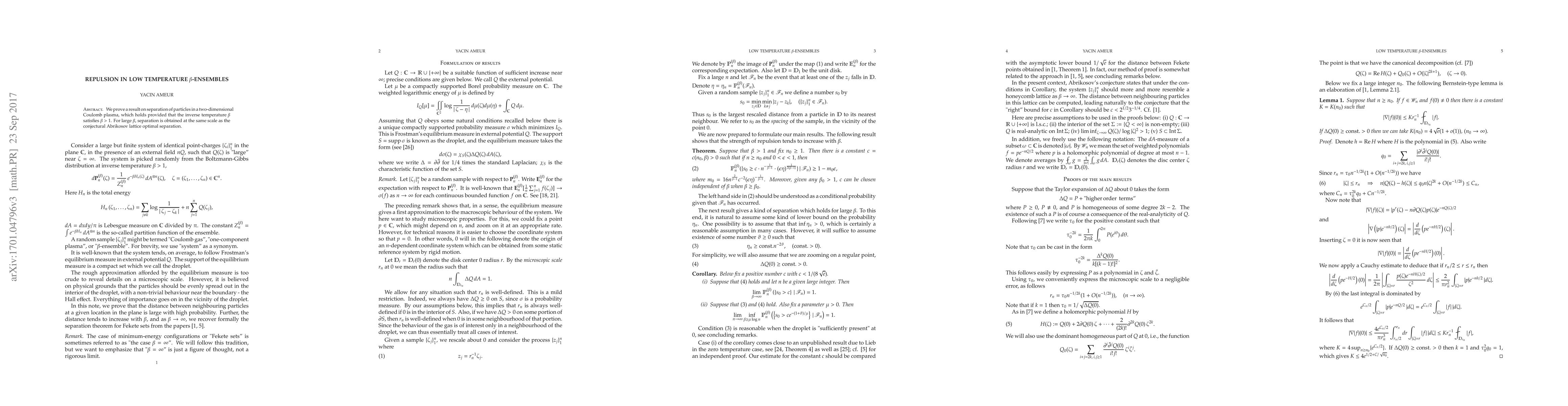 We prove a result on separation of particles in a two-dimensional Coulomb plasma, which holds provided that the inverse temperature $\beta$ satisfies $\beta>1$. For large $\beta$, separation is obtained at the same scale as the conjectural Abrikosov lattice optimal separation.