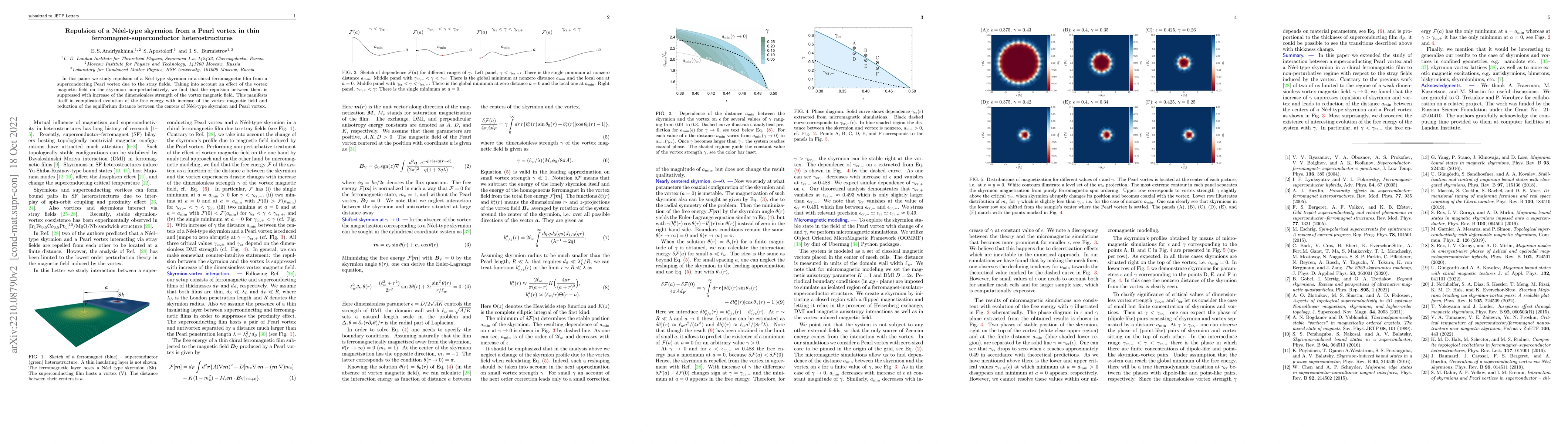 This paper investigates the repulsion between a N\'eel-type skyrmion in a chiral ferromagnetic film and a Pearl vortex in a ferromagnet-superconductor heterostructure. It finds that the repulsion is suppressed as the vortex magnetic field strength increases, leading to a complex free energy evolution and a reduced equilibrium distance between the skyrmion and vortex.