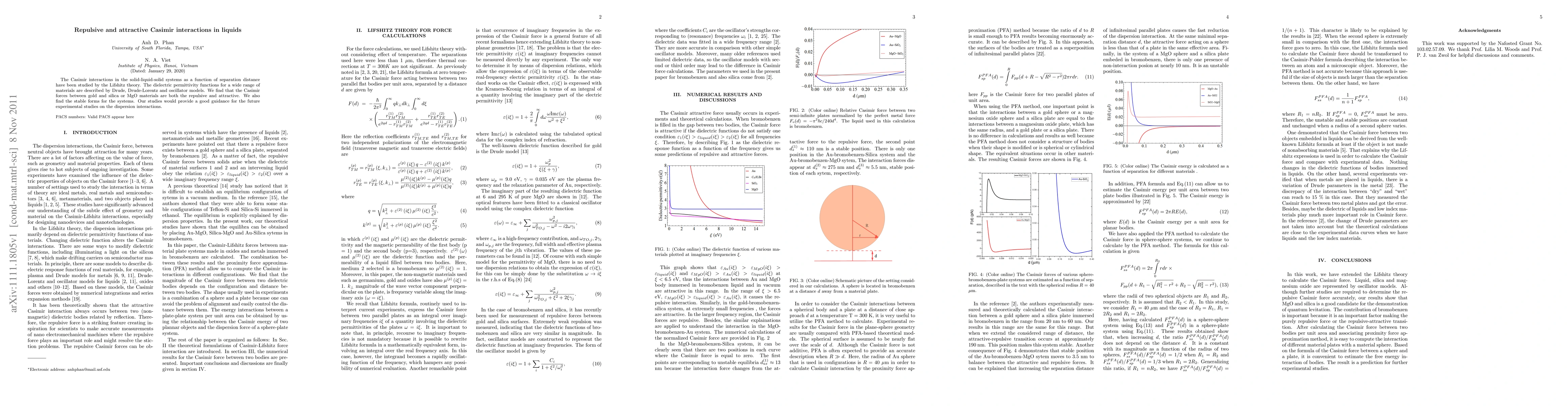 The Casimir interactions in the solid-liquid-solid systems as a function of separation distance have been studied by the Lifshitz theory. The dielectric permittivity functions for a wide range of materials are described by Drude, Drude-Lorentz and oscillator models. We find that the Casimir forces between gold and silica or MgO materials are both the repulsive and attractive. We also find the stable forms for the systems. Our studies would provide a good guidance for the future experimental studies on the dispersion interactions.