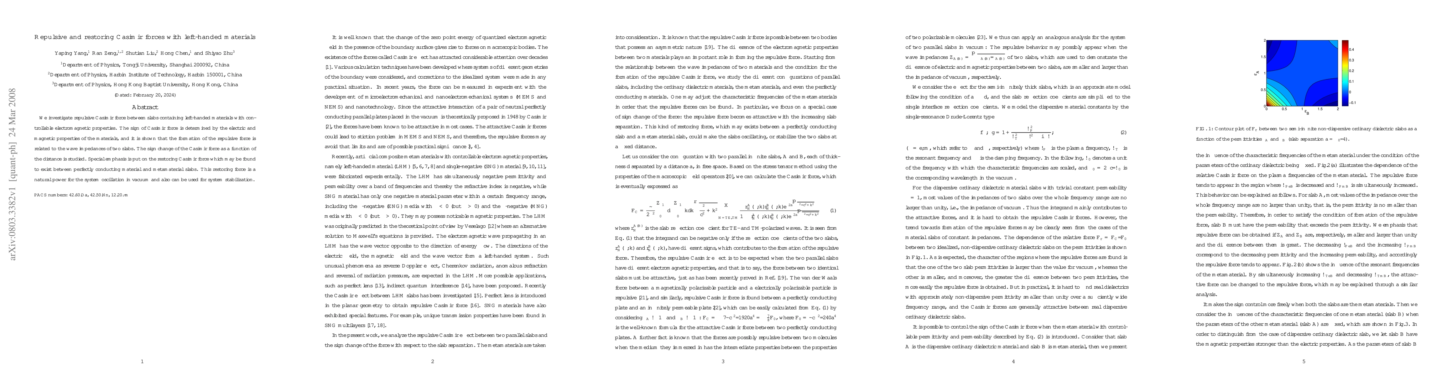This paper explores the Casimir force between slabs containing left-handed materials, demonstrating that the force can be repulsive or restoring, depending on the materials' electromagnetic properties and wave impedances. The study highlights the potential for restoring Casimir forces to stabilize systems and enable vacuum oscillations.