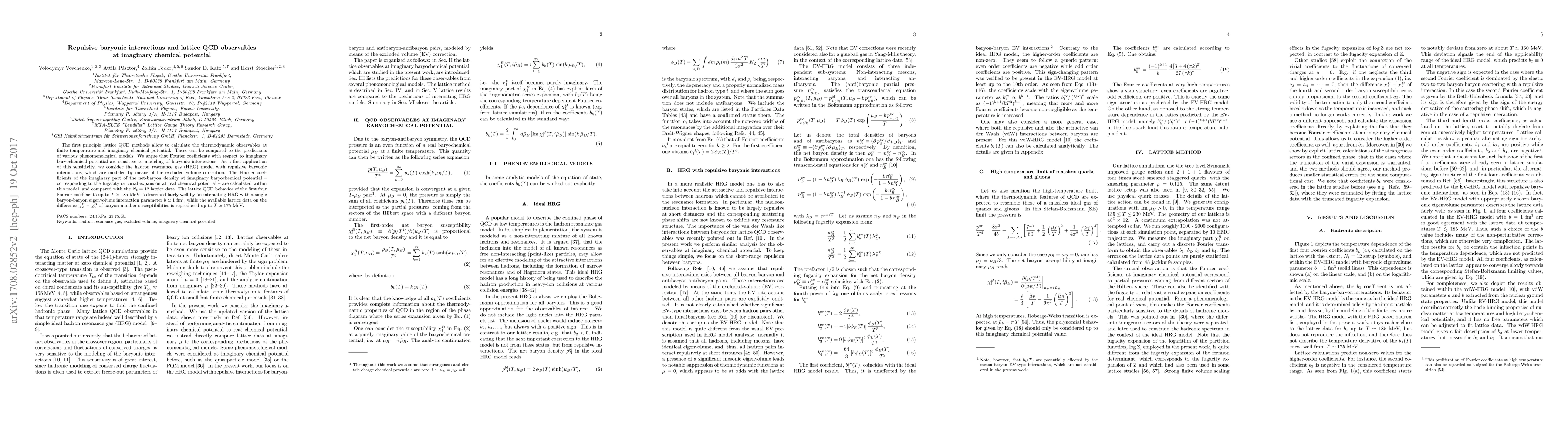 The first principle lattice QCD methods allow to calculate the thermodynamic observables at finite temperature and imaginary chemical potential. These can be compared to the predictions of various phenomenological models. We argue that Fourier coefficients with respect to imaginary baryochemical potential are sensitive to modeling of baryonic interactions. As a first application of this sensitivity, we consider the hadron resonance gas (HRG) model with repulsive baryonic interactions, which are modeled by means of the excluded volume correction. The Fourier coefficients of the imaginary part of the net-baryon density at imaginary baryochemical potential -- corresponding to the fugacity or virial expansion at real chemical potential -- are calculated within this model, and compared with the $N_t = 12$ lattice data. The lattice QCD behavior of the first four Fourier coefficients up to $T \simeq 185$ MeV is described fairly well by an interacting HRG with a single baryon-baryon eigenvolume interaction parameter $b \simeq 1$ fm$^3$, while the available lattice data on the difference $\chi_2^B - \chi_4^B$ of baryon number susceptibilities is reproduced up to $T \simeq 175$ MeV.