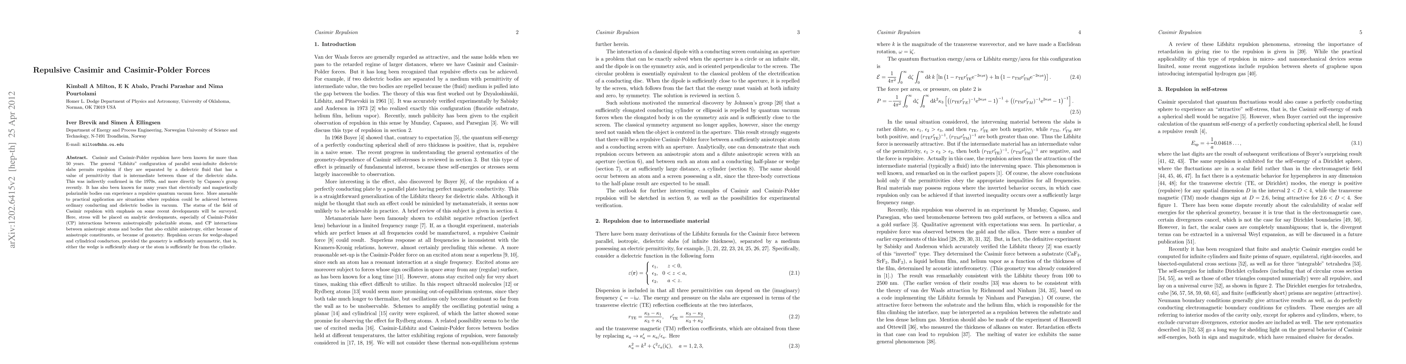 Casimir and Casimir-Polder repulsion have been known for more than 50 years. The general "Lifshitz" configuration of parallel semi-infinite dielectric slabs permits repulsion if they are separated by a dielectric fluid that has a value of permittivity that is intermediate between those of the dielectric slabs. This was indirectly confirmed in the 1970s, and more directly by Capasso's group recently. It has also been known for many years that electrically and magnetically polarizable bodies can experience a repulsive quantum vacuum force. More amenable to practical application are situations where repulsion could be achieved between ordinary conducting and dielectric bodies in vacuum. The status of the field of Casimir repulsion with emphasis on recent developments will be surveyed. Here, stress will be placed on analytic developments, especially of Casimir-Polder (CP) interactions between anisotropically polarizable atoms, and CP interactions between anisotropic atoms and bodies that also exhibit anisotropy, either because of anisotropic constituents, or because of geometry. Repulsion occurs for wedge-shaped and cylindrical conductors, provided the geometry is sufficiently asymmetric, that is, either the wedge is sufficiently sharp or the atom is sufficiently far from the cylinder.