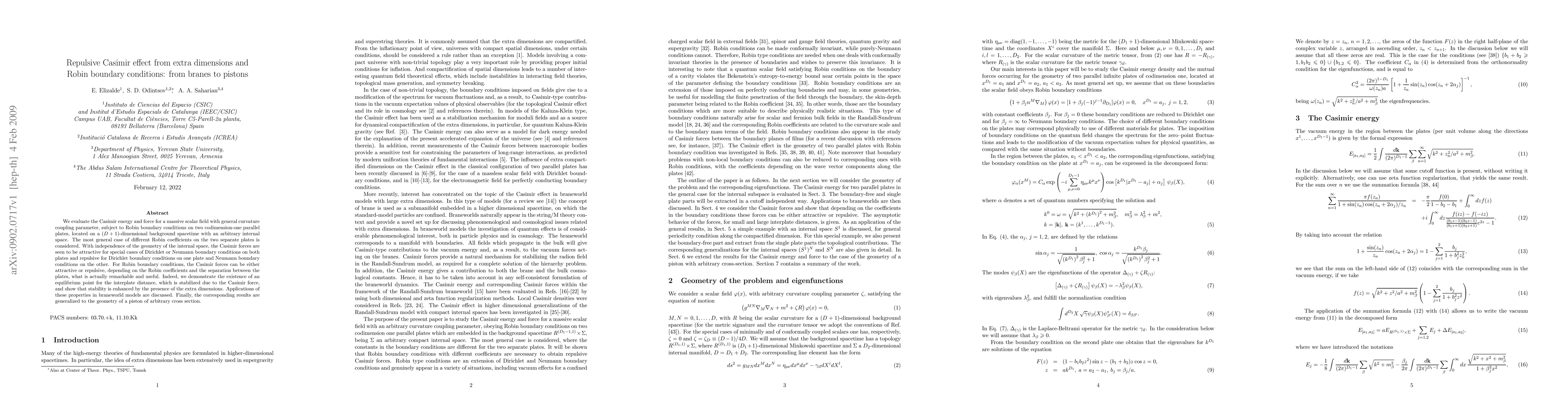 This paper investigates the Casimir effect in $(D+1)$-dimensional spacetimes with Robin boundary conditions, revealing that the Casimir force can be either attractive or repulsive depending on the boundary conditions and separation distance. The study highlights the stabilization of equilibrium distances due to the Casimir force, with enhanced stability in extra dimensions, and extends findings to piston geometries.