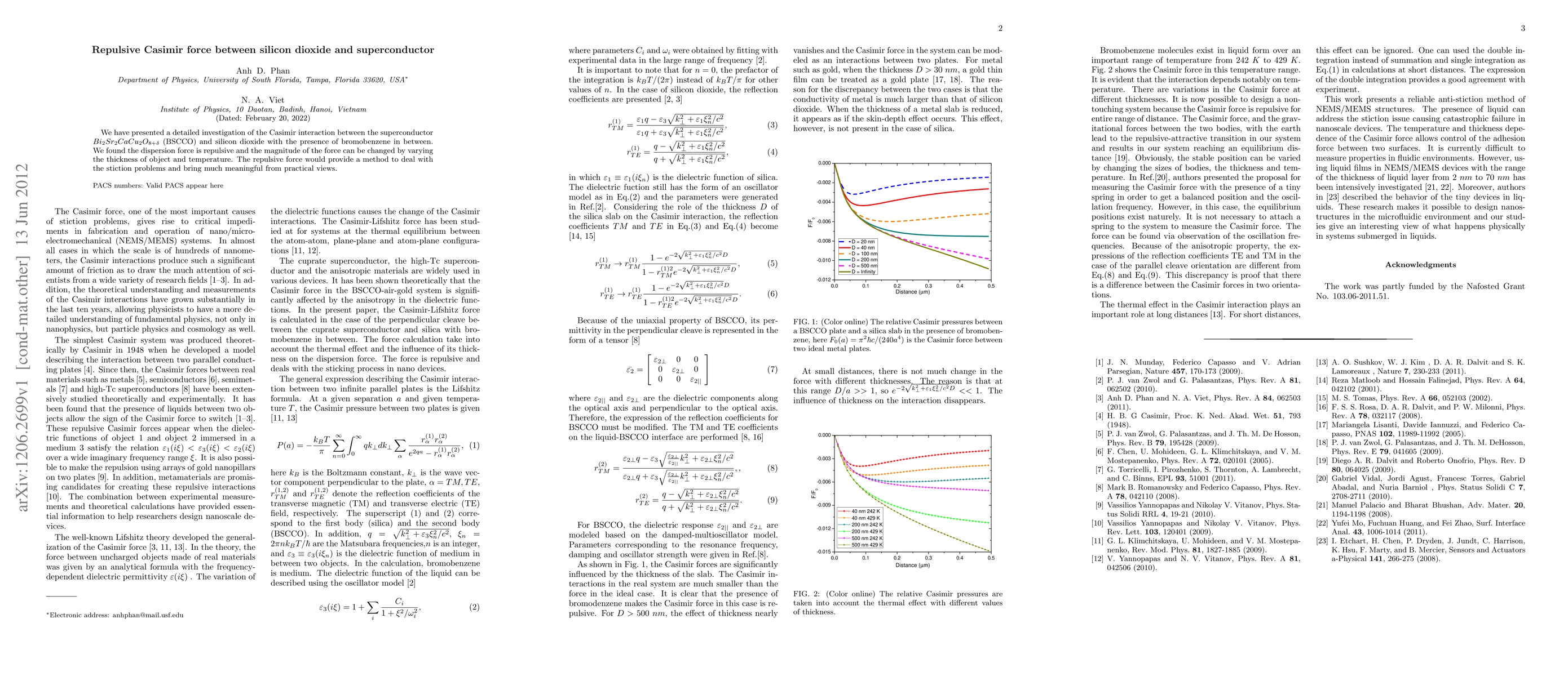 This study investigates the repulsive Casimir force between a superconductor (BSCCO) and silicon dioxide with bromobenzene in between, revealing a tunable dispersion force influenced by object thickness and temperature, potentially addressing stiction issues.