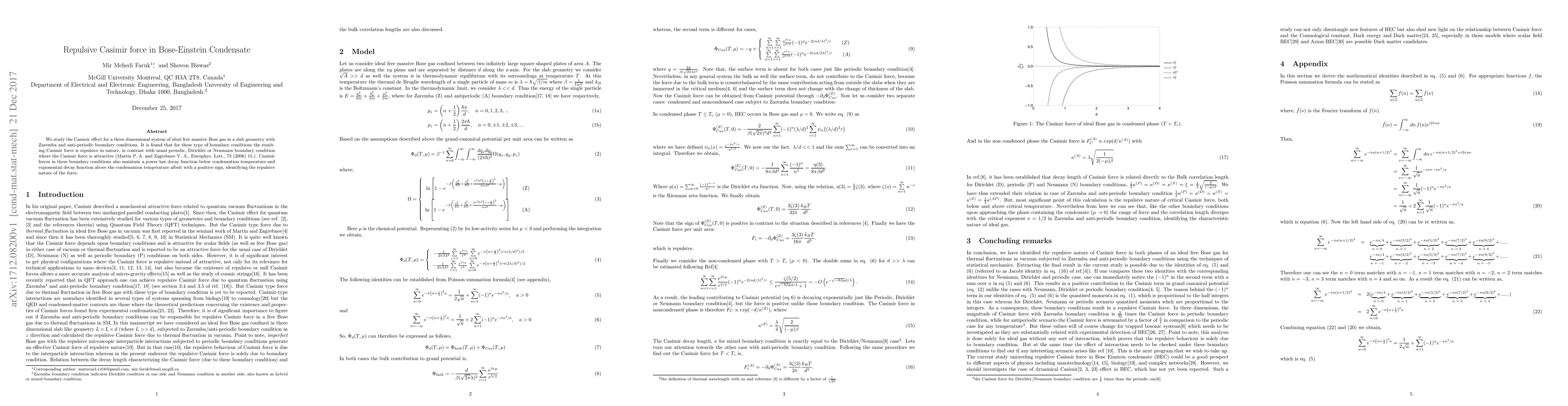 This paper investigates the Casimir effect in a three-dimensional Bose-Einstein condensate under Zaremba and anti-periodic boundary conditions, revealing a repulsive Casimir force instead of the usual attractive force. The force exhibits a power law decay below the condensation temperature and an exponential decay above, confirming its repulsive nature.