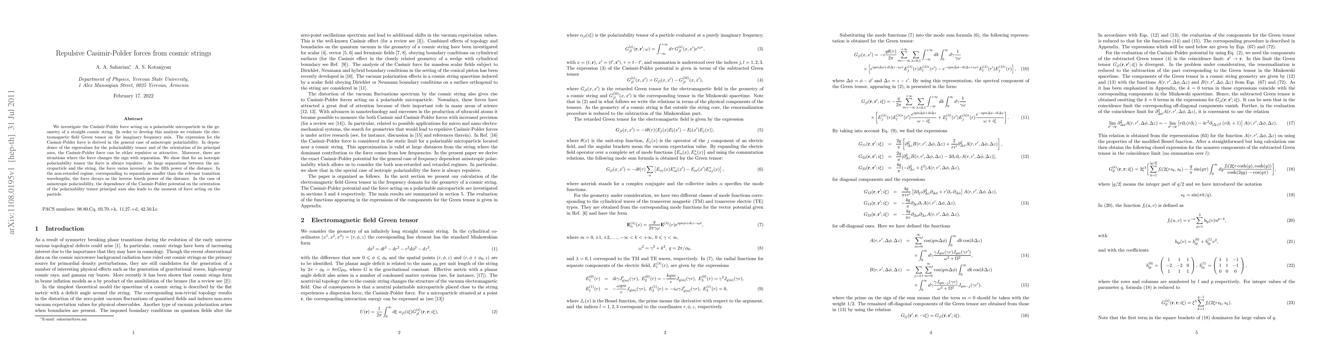This paper explores the Casimir-Polder force on a polarizable microparticle near a cosmic string, revealing that the force can be either repulsive or attractive depending on the polarizability tensor's eigenvalues and orientation. For isotropic polarizability, the force is always repulsive, varying inversely as the fifth power at large separations.