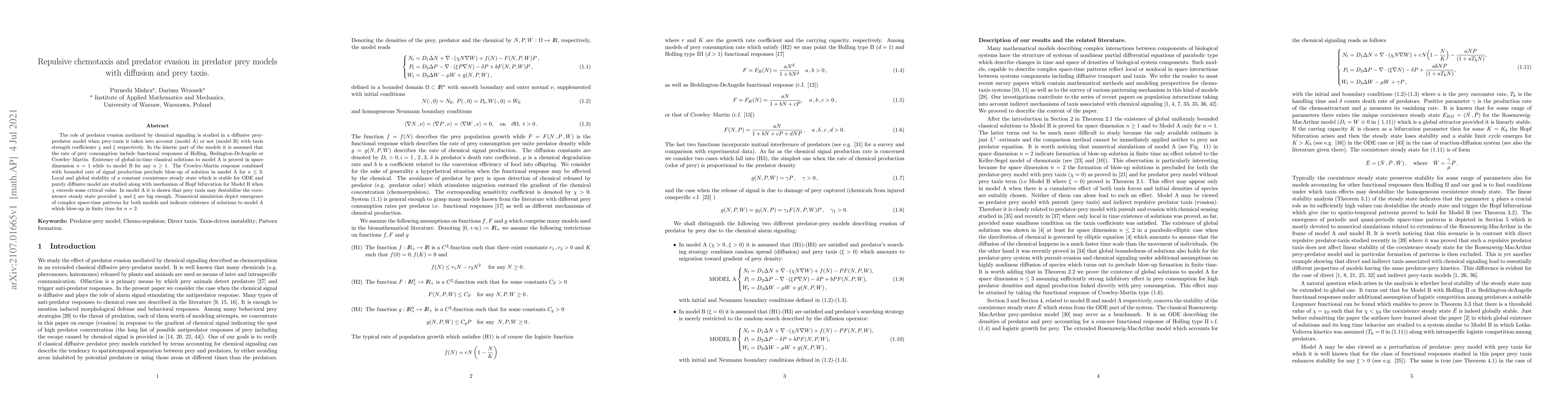 The role of predator evasion mediated by chemical signaling is studied in a diffusive prey-predator model when prey-taxis is taken into account (model A) or not (model B) with taxis strength coefficients $\chi$ and $\xi$ respectively. In the kinetic part of the models it is assumed that the rate of prey consumption includes functional responses of Holling, Bedington-DeAngelis or Crowley-Martin. Existence of global-in-time classical solutions to model A is proved in space dimension n=1 while to model B for any $n\geq 1$. The Crowley-Martin response combined with bounded rate of signal production precludes blow-up of solution in model A for $n\leq 3$. Local and global stability of a constant coexistence steady state which is stable for ODE and purely diffusive model are studied along with mechanism of Hopf bifurcation for Model B when $\chi$ exceeds some critical value. In model A it is shown that prey taxis may destabilize the coexistence steady state provided $\chi$ and $\xi$ are big enough. Numerical simulation depicts emergence of complex space-time patterns for both models and indicate existence of solutions to model A which blow-up in finite time for $n=2$