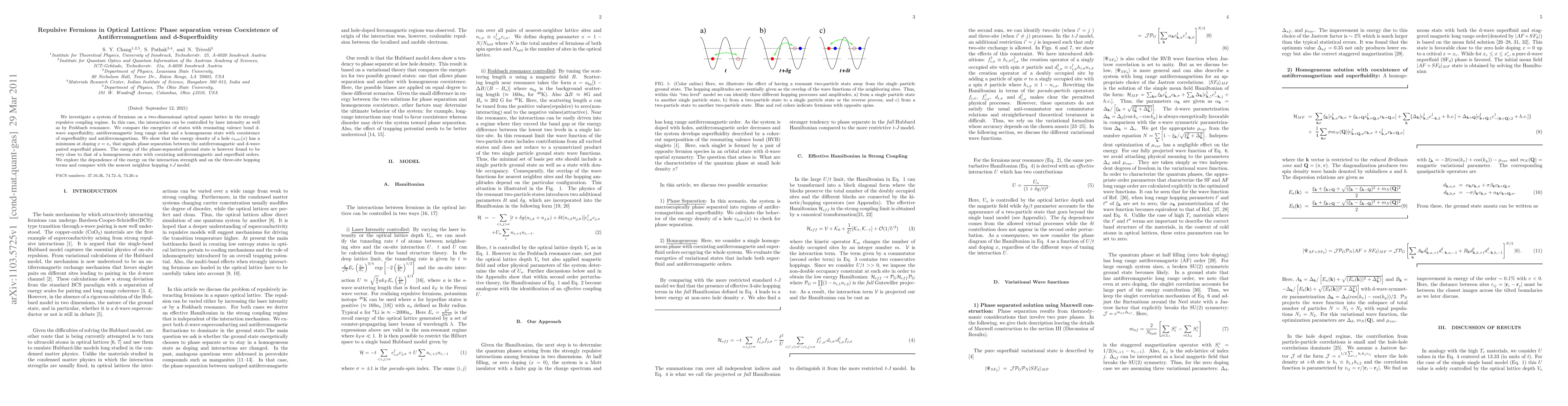 We investigate a system of fermions on a two-dimensional optical square lattice in the strongly repulsive coupling regime. In this case, the interactions can be controlled by laser intensity as well as by Feshbach resonance. We compare the energetics of states with resonating valence bond d-wave superfluidity, antiferromagnetic long range order and a homogeneous state with coexistence of superfluidity and antiferromagnetism. We show that the energy density of a hole $e_{hole}(x)$ has a minimum at doping $x=x_c$ that signals phase separation between the antiferromagnetic and d-wave paired superfluid phases. The energy of the phase-separated ground state is however found to be very close to that of a homogeneous state with coexisting antiferromagnetic and superfluid orders. We explore the dependence of the energy on the interaction strength and on the three-site hopping terms and compare with the nearest neighbor hopping {\it t-J} model.