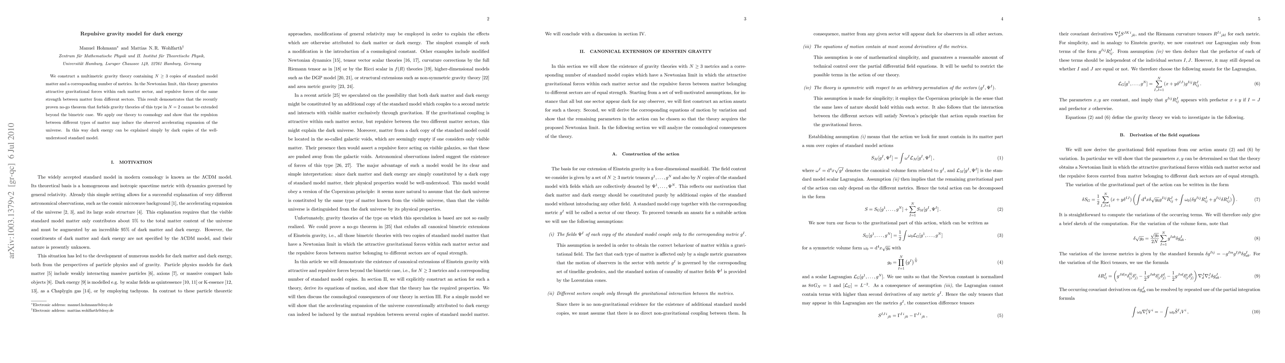 We construct a multimetric gravity theory containing N >= 3 copies of standard model matter and a corresponding number of metrics. In the Newtonian limit, this theory generates attractive gravitational forces within each matter sector, and repulsive forces of the same strength between matter from different sectors. This result demonstrates that the recently proven no-go theorem that forbids gravity theories of this type in N = 2 cannot be extended beyond the bimetric case. We apply our theory to cosmology and show that the repulsion between different types of matter may induce the observed accelerating expansion of the universe. In this way dark energy can be explained simply by dark copies of the well-understood standard model.