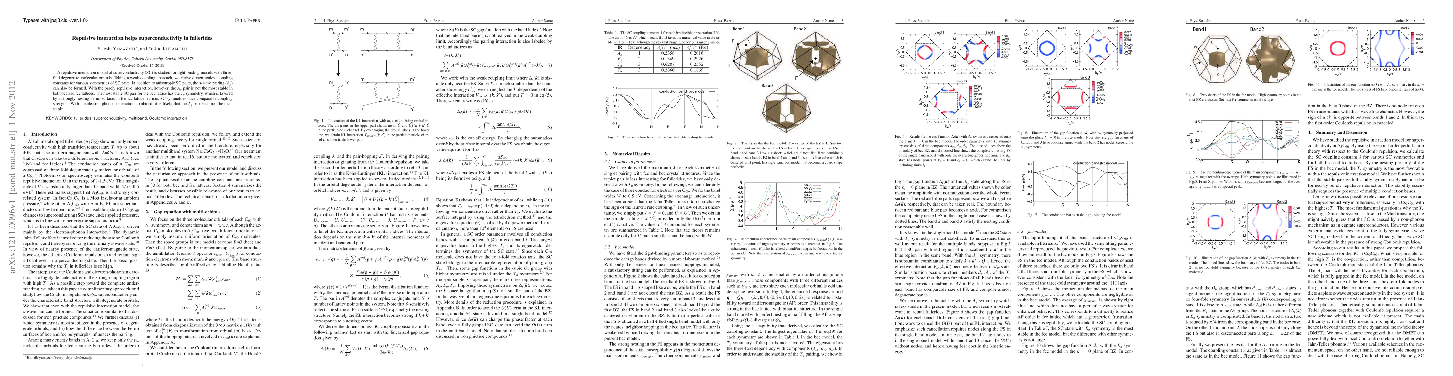 A repulsive interaction model of superconductivity (SC) is studied for tight-binding models with three-fold degenerate molecular orbitals. Taking a weak-coupling approach, we derive dimensionless coupling constants for various symmetries of SC pairs. In addition to anisotropic SC pairs, the s-wave pairing ($A_g$) can also be formed. With the purely repulsive interaction, however, the $A_g$ pair is not the most stable in both bcc and fcc lattices. The most stable SC pair for the bcc lattice has the $T_g$ symmetry, which is favored by a strongly nesting Fermi surface. In the fcc lattice, various SC symmetries have comparable coupling strengths. With the electron-phonon interaction combined, it is likely that the $A_g$ pair becomes the most stable.