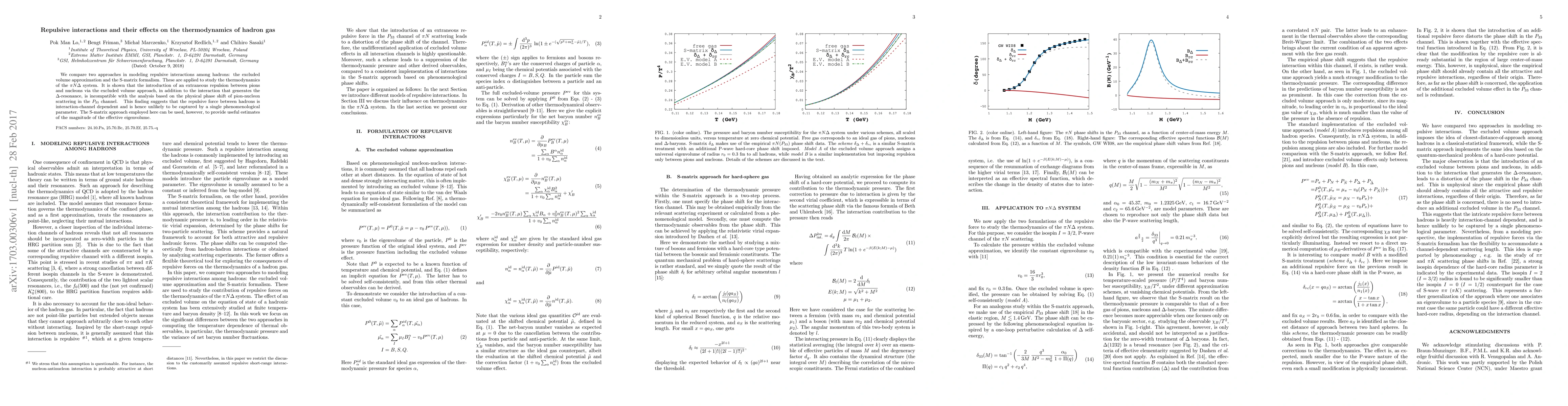 We compare two approaches in modeling repulsive interactions among hadrons: the excluded volume approximation and the S-matrix formalism. These are applied to study the thermodynamics of the $\pi N \Delta$ system. It is shown that the introduction of an extraneous repulsion between pions and nucleons via the excluded volume approach, in addition to the interaction that generates the $\Delta$-resonance, is incompatible with the analysis based on the physical phase shift of pion-nucleon scattering in the $P_{33}$ channel. This finding suggests that the repulsive force between hadrons is interaction-channel dependent and is hence unlikely to be captured by a single phenomenological parameter. The S-matrix approach employed here can be used, however, to provide useful estimates of the magnitude of the effective eigenvolume.