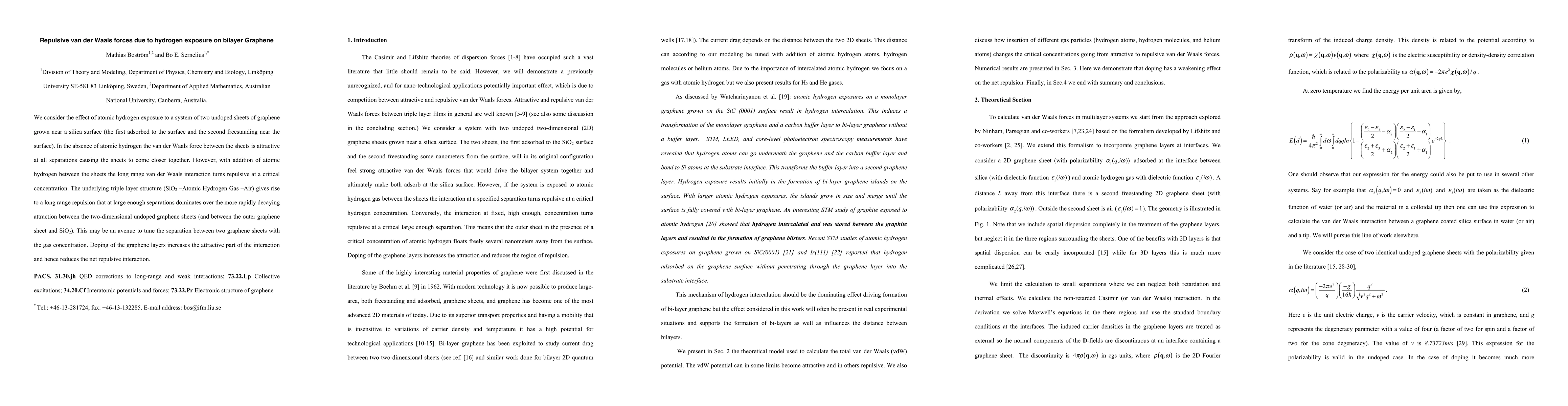 We consider the effect of atomic hydrogen exposure to a system of two undoped sheets of graphene grown near a silica surface (the first adsorbed to the surface and the second freestanding near the surface). In the absence of atomic hydrogen the van der Waals force between the sheets is attractive at all separations causing the sheets to come closer together. However, with addition of atomic hydrogen between the sheets the long range van der Waals interaction turns repulsive at a critical concentration. The underlying triple layer structure (SiO2 -Atomic Hydrogen Gas -Air) gives rise to a long range repulsion that at large enough separations dominates over the more rapidly decaying attraction between the two-dimensional undoped graphene sheets (and between the outer graphene sheet and SiO2). This may be an avenue to tune the separation between two graphene sheets with the gas concentration. Doping of the graphene layers increases the attractive part of the interaction and hence reduces the net repulsive interaction.