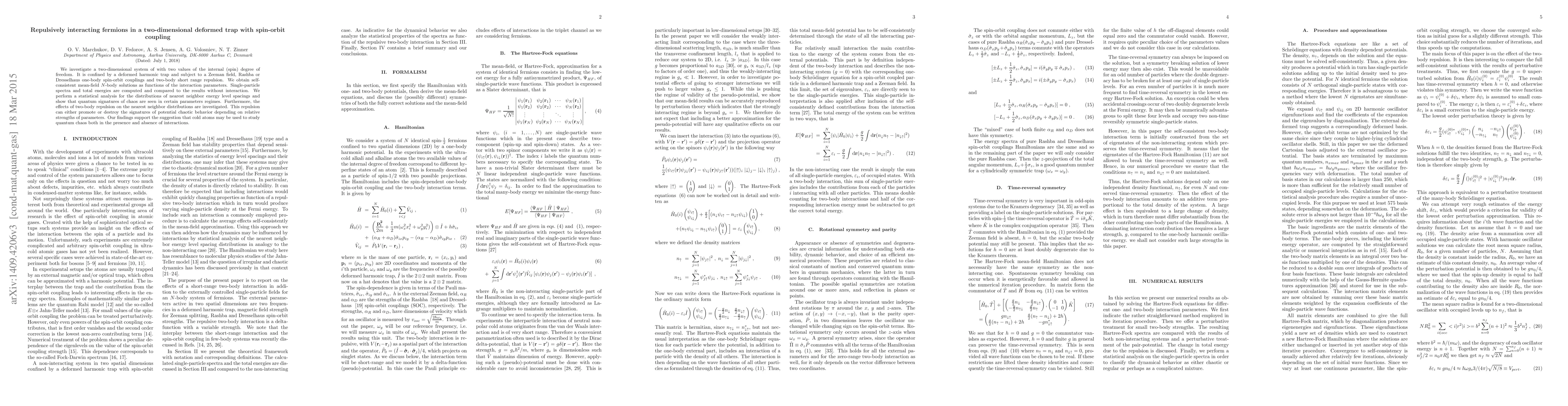 We investigate a two-dimensional system of with two values of the internal (spin) degree of freedom. It is confined by a deformed harmonic trap and subject to a Zeeman field, Rashba or Dresselhaus one-body spin-orbit couplings and two-body short range repulsion. We obtain self-consistent mean-field $N$-body solutions as functions of the interaction parameters. Single-particle Spectra and total energies are computed and compared to the results without interaction. We perform a statistical analysis for the distributions of nearest neighbor energy level spacings and show that quantum signatures of chaos are seen in certain parameters regimes. Furthermore, the effects of two-body repulsion on the nearest neighbor distributions are investigated. This repulsion can either promote or destroy the signatures of potential chaotic behavior depending on relative strengths of parameters. Our findings support the suggestion that cold atoms may be used to study quantum chaos both in the presence and absence of interactions.