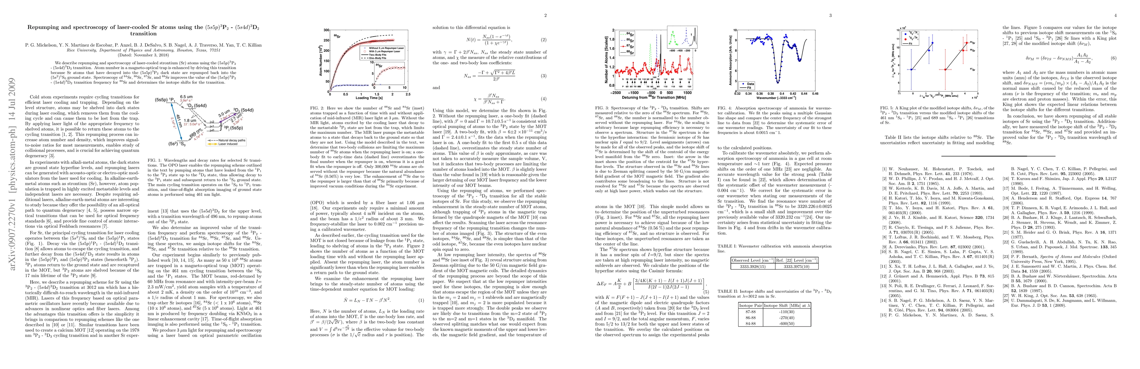 We describe repumping and spectroscopy of laser-cooled strontium (Sr) atoms using the (5s5p)3P2 - (5s4d)3D2 transition. Atom number in a magneto-optical trap is enhanced by driving this transition because Sr atoms that have decayed into the (5s5p)3P2 dark state are repumped back into the (5s2)1S0 ground state. Spectroscopy of 84Sr, 86Sr, 87Sr, and 88Sr improves the value of the (5s5p)3P2 - (5s4d)3D2 transition frequency for 88Sr and determines the isotope shifts for the transition.