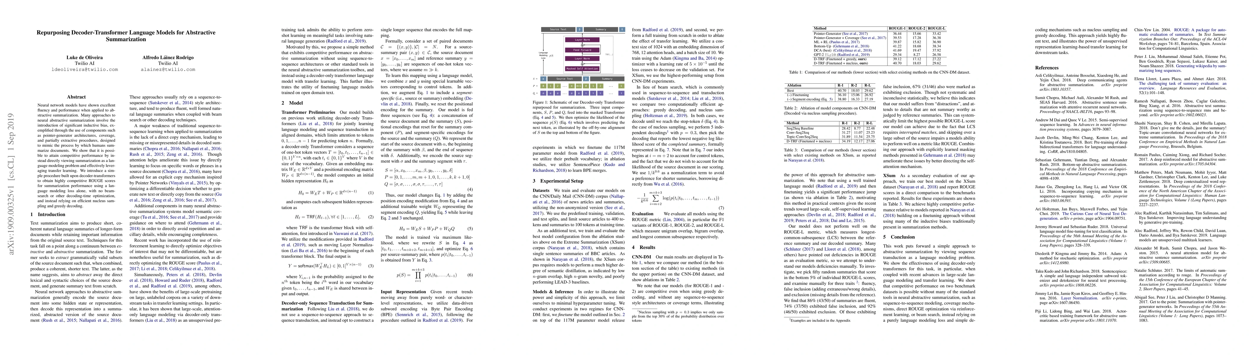 This paper demonstrates that decoder-transformer language models can achieve competitive abstractive summarization performance by treating summarization as a language modeling task, leveraging transfer learning, and utilizing nucleus sampling and greedy decoding instead of complex decoding-time optimizations. The approach achieves high ROUGE scores without the need for beam search or other specialized architectures.