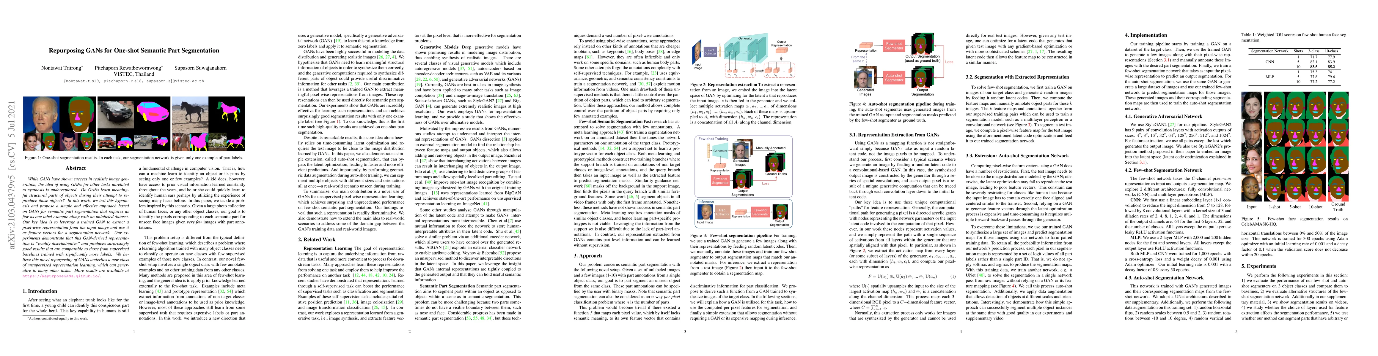 This paper explores repurposing GANs for one-shot semantic part segmentation, demonstrating that GANs can extract meaningful structural representations from objects. The proposed method uses GAN-generated features for segmentation, achieving results comparable to supervised methods with significantly more labels.