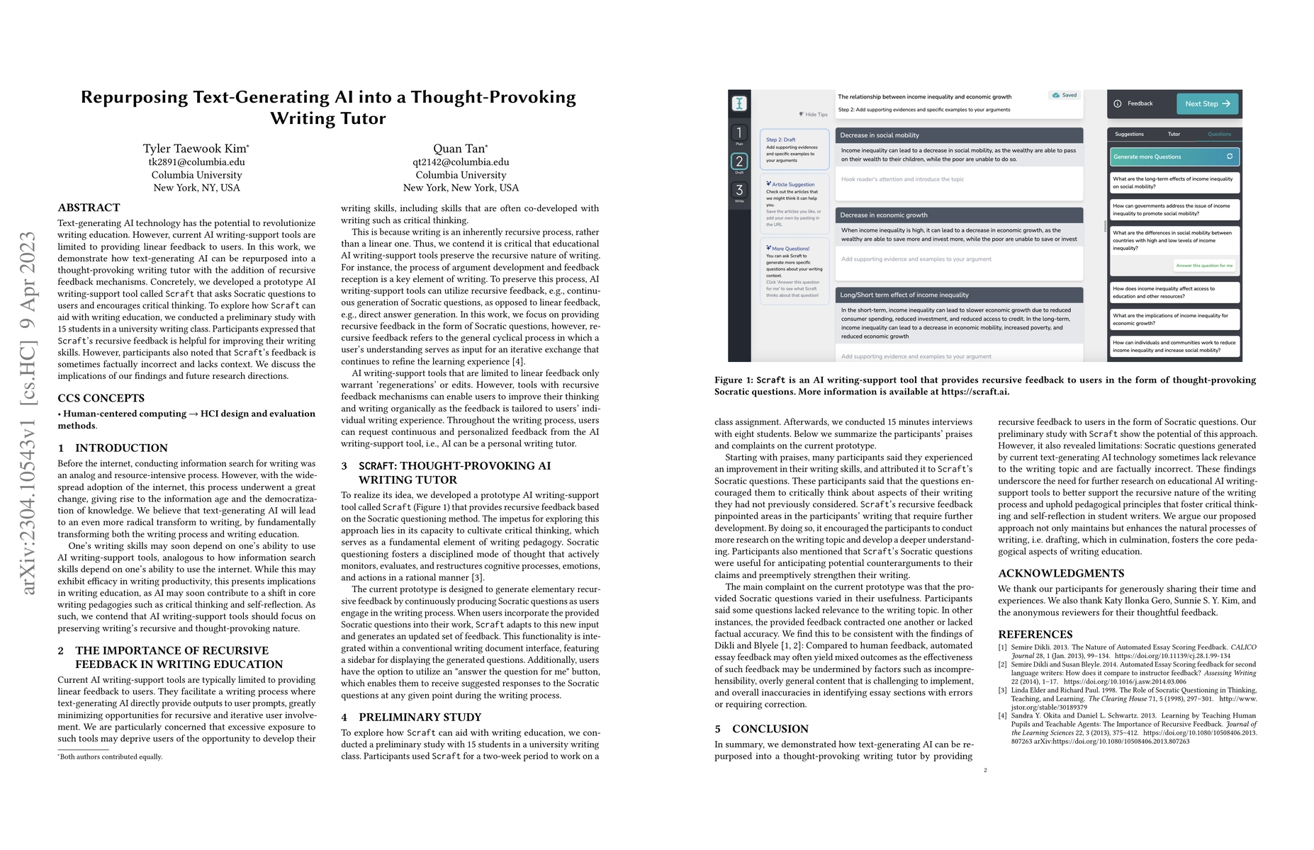 This paper explores repurposing text-generating AI into a writing tutor named Scraft that uses recursive feedback and Socratic questioning to enhance critical thinking. Preliminary study results show mixed feedback, highlighting both benefits and areas for improvement in AI-assisted writing education.
