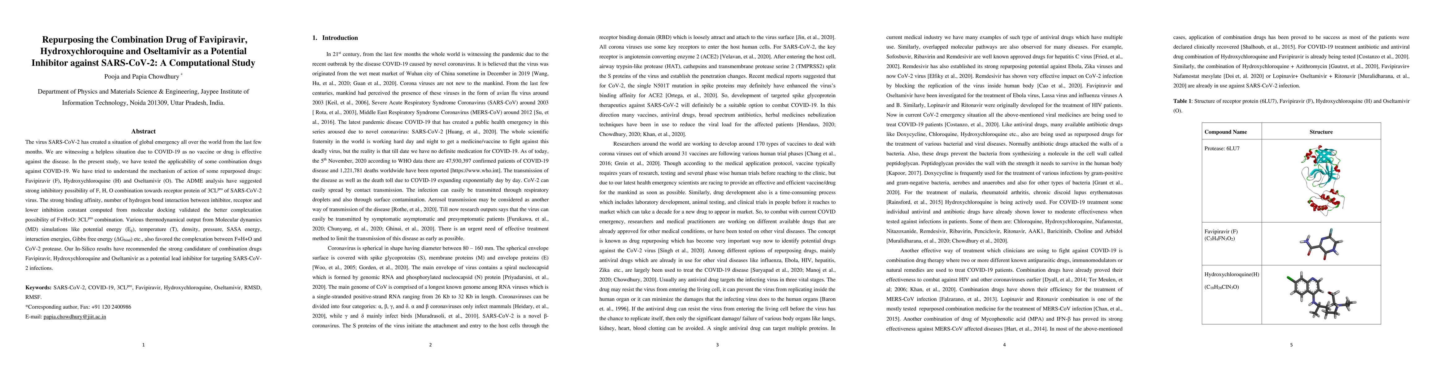 The virus SARS-CoV-2 has created a situation of global emergency all over the world from the last few months. We are witnessing a helpless situation due to COVID-19 as no vaccine or drug is effective against the disease. In the present study, we have tested the applicability of some combination drugs against COVID-19. We have tried to understand the mechanism of action of some repurposed drugs: Favipiravir (F), Hydroxychloroquine (H) and Oseltamivir (O). The ADME analysis have suggested strong inhibitory possibility of F, H, O combination towards receptor protein of $3CL^{pro}$ of SARS-CoV-2 virus. The strong binding affinity, number of hydrogen bond interaction between inhibitor, receptor and lower inhibition constant computed from molecular docking validated the better complexation possibility of F+H+O: $3CL^{pro}$ combination. Various thermodynamical output from Molecular dynamics (MD) simulations like potential energy ($E_g$), temperature (T), density, pressure, SASA energy, interaction energies, Gibbs free energy ($\Delta G_{bind}$) etc., also favored the complexation between F+H+O and CoV-2 protease. Our In-Silico results have recommended the strong candidature of combination drugs Favipiravir, Hydroxychloroquine and Oseltamivir as a potential lead inhibitor for targeting SARS-CoV-2 infections.