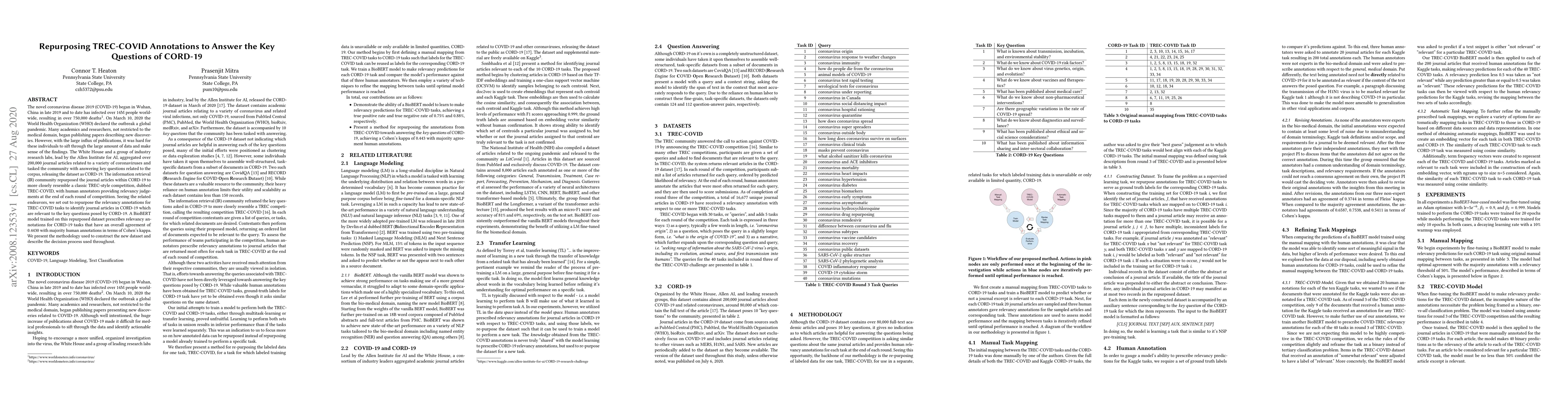 The novel coronavirus disease 2019 (COVID-19) began in Wuhan, China in late 2019 and to date has infected over 14M people worldwide, resulting in over 750,000 deaths. On March 10, 2020 the World Health Organization (WHO) declared the outbreak a global pandemic. Many academics and researchers, not restricted to the medical domain, began publishing papers describing new discoveries. However, with the large influx of publications, it was hard for these individuals to sift through the large amount of data and make sense of the findings. The White House and a group of industry research labs, lead by the Allen Institute for AI, aggregated over 200,000 journal articles related to a variety of coronaviruses and tasked the community with answering key questions related to the corpus, releasing the dataset as CORD-19. The information retrieval (IR) community repurposed the journal articles within CORD-19 to more closely resemble a classic TREC-style competition, dubbed TREC-COVID, with human annotators providing relevancy judgements at the end of each round of competition. Seeing the related endeavors, we set out to repurpose the relevancy annotations for TREC-COVID tasks to identify journal articles in CORD-19 which are relevant to the key questions posed by CORD-19. A BioBERT model trained on this repurposed dataset prescribes relevancy annotations for CORD-19 tasks that have an overall agreement of 0.4430 with majority human annotations in terms of Cohen's kappa. We present the methodology used to construct the new dataset and describe the decision process used throughout.