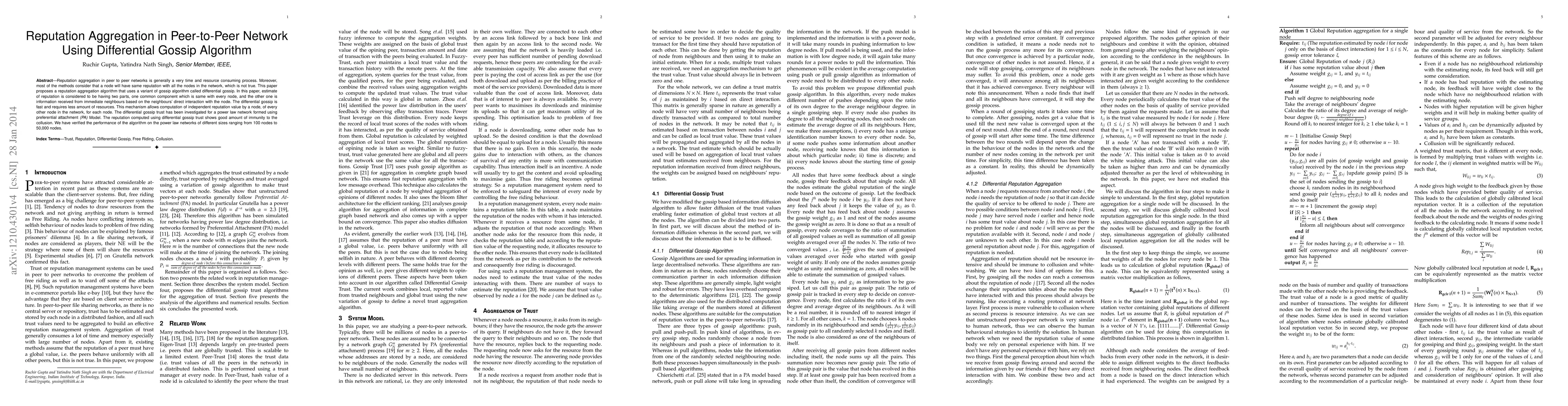This paper proposes a differential gossip algorithm for efficient reputation aggregation in peer-to-peer networks, distinguishing between a common reputation component and individual neighbor-based reputations. The method is resource-efficient and demonstrates strong immunity to collusion, tested on power law networks of varying sizes.