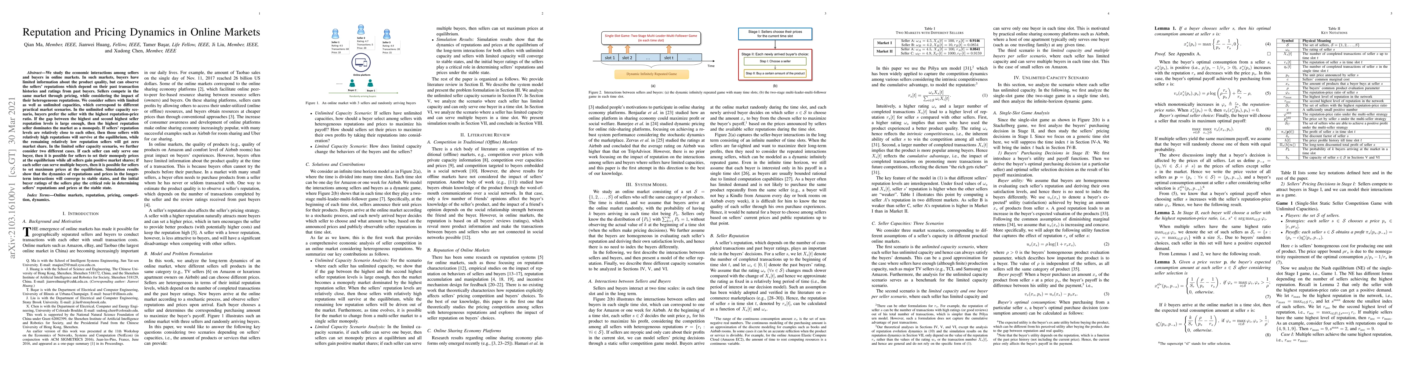 We study the economic interactions among sellers and buyers in online markets. In such markets, buyers have limited information about the product quality, but can observe the sellers' reputations which depend on their past transaction histories and ratings from past buyers. Sellers compete in the same market through pricing, while considering the impact of their heterogeneous reputations. We consider sellers with limited as well as unlimited capacities, which correspond to different practical market scenarios. In the unlimited seller capacity scenario, buyers prefer the seller with the highest reputation-price ratio. If the gap between the highest and second highest seller reputation levels is large enough, then the highest reputation seller dominates the market as a monopoly. If sellers' reputation levels are relatively close to each other, then those sellers with relatively high reputations will survive at the equilibrium, while the remaining relatively low reputation sellers will get zero market share. In the limited seller capacity scenario, we further consider two different cases. If each seller can only serve one buyer, then it is possible for sellers to set their monopoly prices at the equilibrium while all sellers gain positive market shares; if each seller can serve multiple buyers, then it is possible for sellers to set maximum prices at the equilibrium. Simulation results show that the dynamics of reputations and prices in the longer-term interactions will converge to stable states, and the initial buyer ratings of the sellers play the critical role in determining sellers' reputations and prices at the stable state.