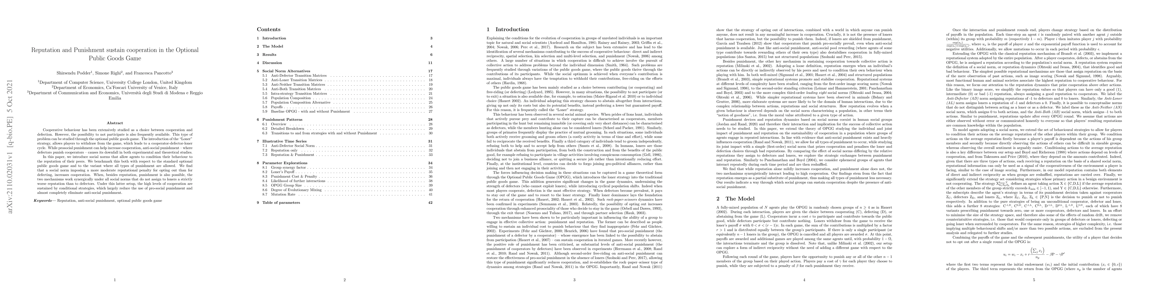 This paper examines how social norms and reputation influence cooperation in the optional public goods game, where players can choose to opt out. It finds that moderate reputational penalties for opting out, combined with punishment mechanisms, significantly enhance cooperation, especially when anti-social punishment is minimized.