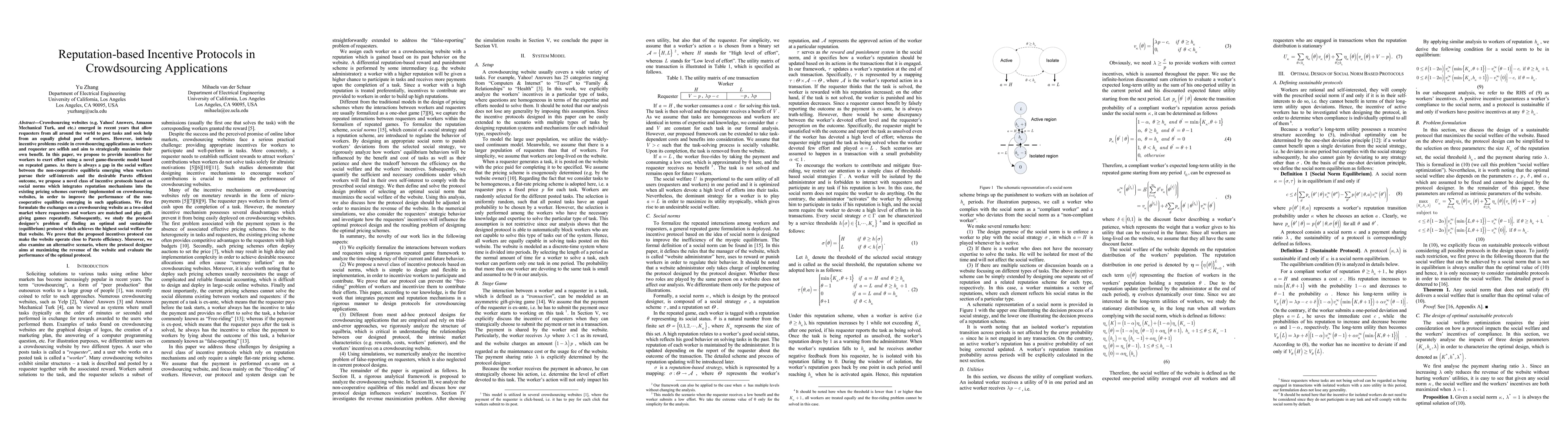 This research paper proposes a novel game-theoretic model to improve crowdsourcing applications by incorporating reputation mechanisms into pricing schemes, aiming to achieve near-Pareto efficiency and maximize revenue.