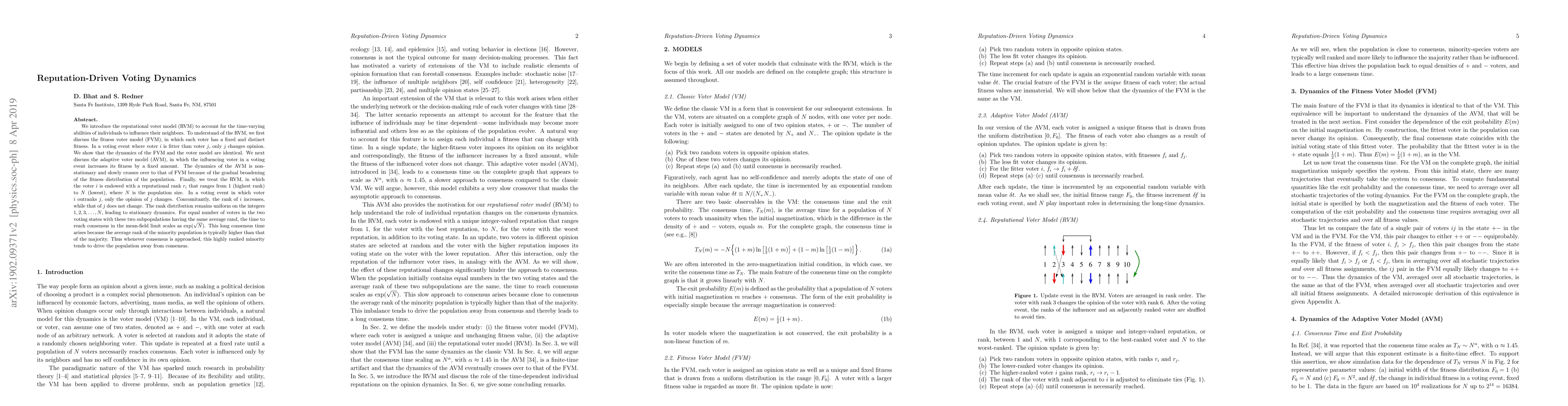 We introduce the reputational voter model (RVM) to account for the time-varying abilities of individuals to influence their neighbors. To understand of the RVM, we first discuss the fitness voter model (FVM), in which each voter has a fixed and distinct fitness. In a voting event where voter $i$ is fitter than voter $j$, only $j$ changes opinion. We show that the dynamics of the FVM and the voter model are identical. We next discuss the adaptive voter model (AVM), in which the influencing voter in a voting event increases its fitness by a fixed amount. The dynamics of the AVM is non-stationary and slowly crosses over to that of FVM because of the gradual broadening of the fitness distribution of the population. Finally, we treat the RVM, in which the voter $i$ is endowed with a reputational rank $r_i$ that ranges from 1 (highest rank) to $N$ (lowest), where $N$ is the population size. In a voting event in which voter $i$ outranks $j$, only the opinion of $j$ changes. Concomitantly, the rank of $i$ increases, while that of $j$ does not change. The rank distribution remains uniform on the integers $1,2,3,\ldots,N$, leading to stationary dynamics. For equal number of voters in the two voting states with these two subpopulations having the same average rand, the time to reach consensus in the mean-field limit scales as $\exp(\sqrt{N})$. This long consensus time arises because the average rank of the minority population is typically higher than that of the majority. Thus whenever consensus is approached, this highly ranked minority tends to drive the population away from consensus.