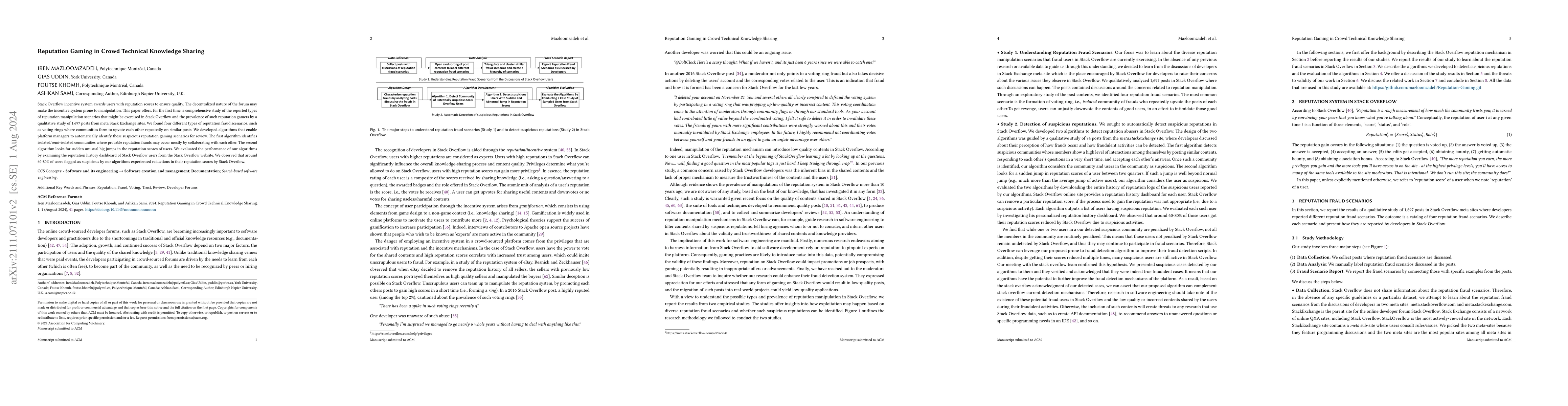 This paper investigates reputation manipulation in Stack Overflow, identifying six types of fraud scenarios, including voting rings. It proposes algorithms to detect suspicious activity, finding that 60-80% of flagged users had their reputation scores removed.