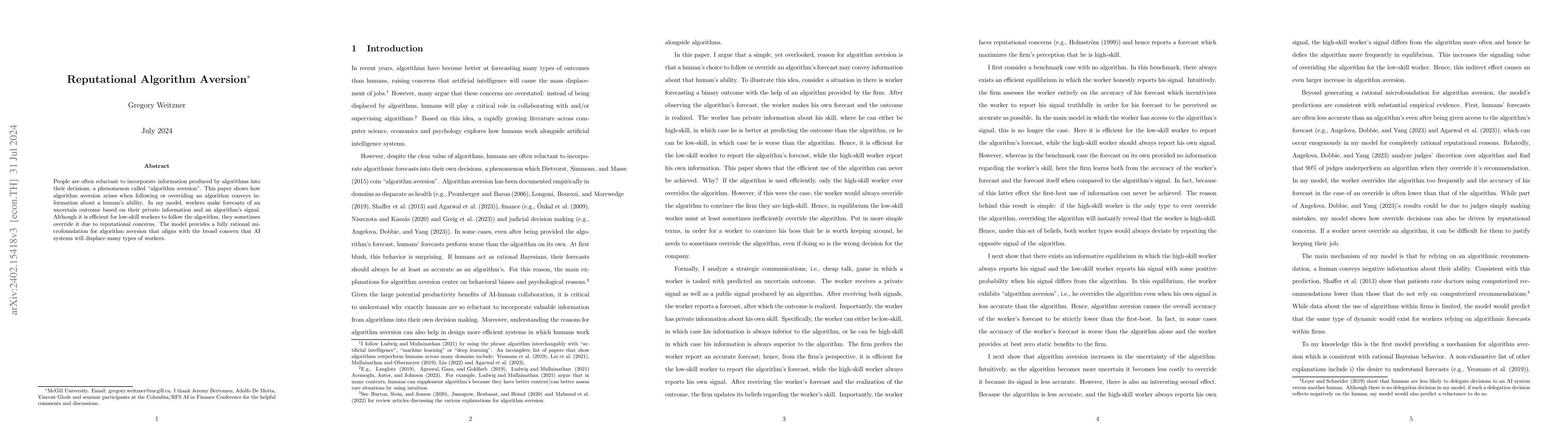 This paper explores "algorithm aversion," where individuals resist using algorithmic information due to reputational concerns. It models how low-skill workers override algorithm recommendations to appear more competent, despite algorithms being more accurate, thus providing a rational explanation for the reluctance to use algorithmic advice.