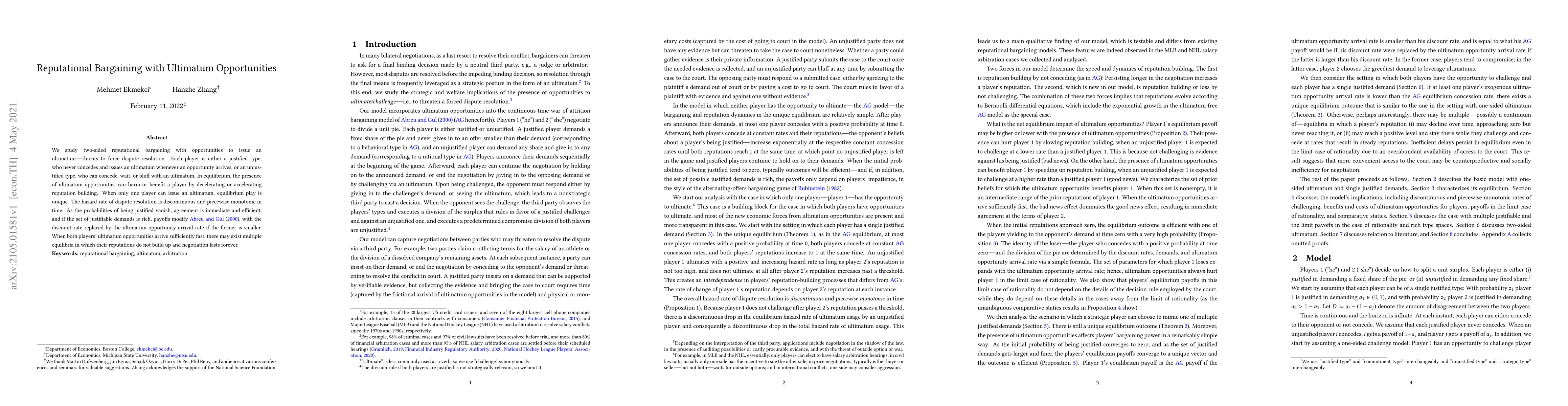 This paper examines two-sided reputational bargaining where players can issue ultimatums to force dispute resolution. It finds that ultimatum opportunities can either decelerate or accelerate reputation building, leading to unique or multiple equilibria depending on the frequency of these opportunities and the players' types.