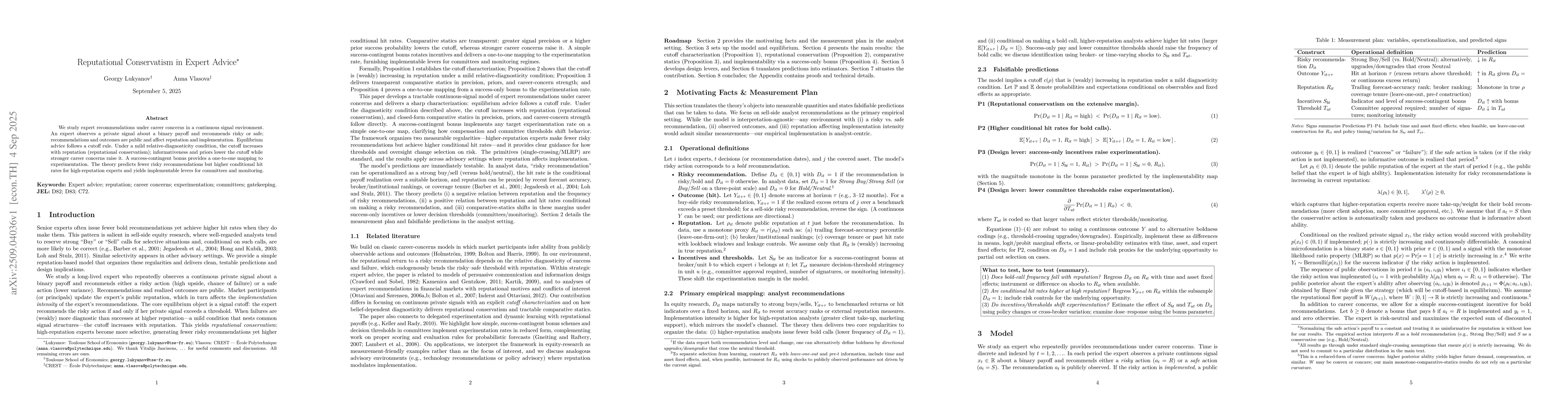 We study expert recommendations under career concerns in a continuous signal environment. An expert observes a private signal about a binary payoff and recommends risky or safe; recommendations and outcomes are public and affect reputation and implementation. Equilibrium advice follows a cutoff rule. Under a mild relative-diagnosticity condition, the cutoff increases with reputation (reputational conservatism); informativeness and priors lower the cutoff while stronger career concerns raise it. A success-contingent bonus provides a one-to-one mapping to experimentation. The theory predicts fewer risky recommendations but higher conditional hit rates for high-reputation experts and yields implementable levers for committees and monitoring.