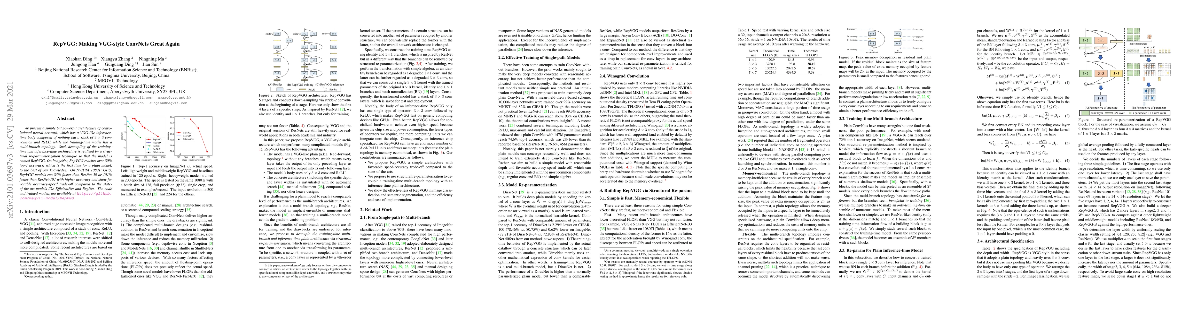 We present a simple but powerful architecture of convolutional neural network, which has a VGG-like inference-time body composed of nothing but a stack of 3x3 convolution and ReLU, while the training-time model has a multi-branch topology. Such decoupling of the training-time and inference-time architecture is realized by a structural re-parameterization technique so that the model is named RepVGG. On ImageNet, RepVGG reaches over 80% top-1 accuracy, which is the first time for a plain model, to the best of our knowledge. On NVIDIA 1080Ti GPU, RepVGG models run 83% faster than ResNet-50 or 101% faster than ResNet-101 with higher accuracy and show favorable accuracy-speed trade-off compared to the state-of-the-art models like EfficientNet and RegNet. The code and trained models are available at https://github.com/megvii-model/RepVGG.