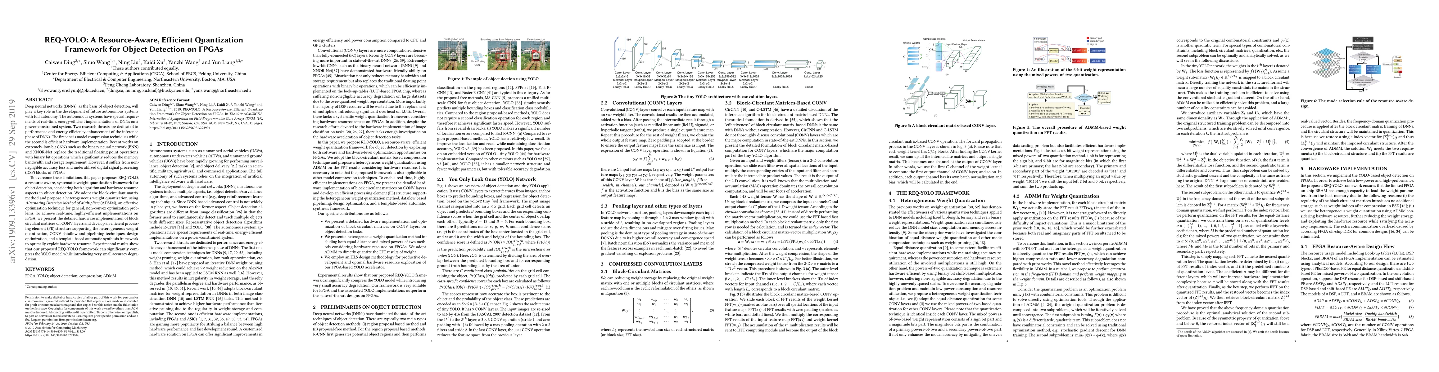 This paper introduces REQ-YOLO, a resource-aware quantization framework for efficient object detection on FPGAs. It combines model compression techniques and hardware optimization to achieve real-time, low-energy implementations while minimizing accuracy loss and optimizing FPGA resource utilization.