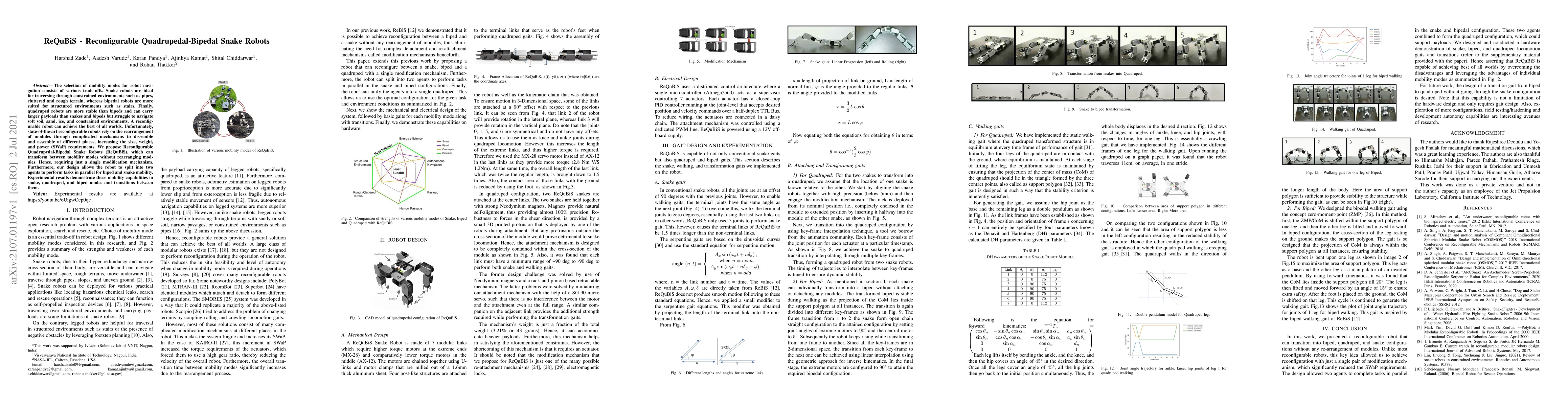 The research proposes Reconfigurable Quadrupedal-Bipedal Snake Robots (ReQuBiS) capable of transforming between mobility modes without rearranging modules, utilizing a single modification mechanism.