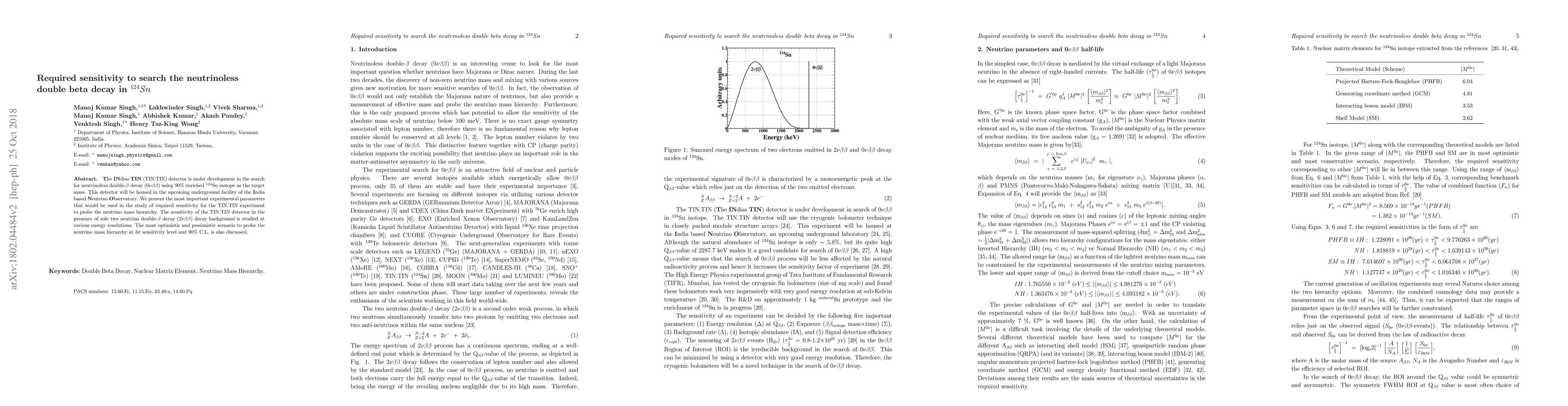 The TIN.TIN detector in the India-based Neutrino Observatory aims to search for neutrinoless double-beta decay (0νββ) using $^{124}$Sn. The study outlines the experimental parameters and sensitivity required to probe the neutrino mass hierarchy, considering both optimistic and pessimistic scenarios for background interference.