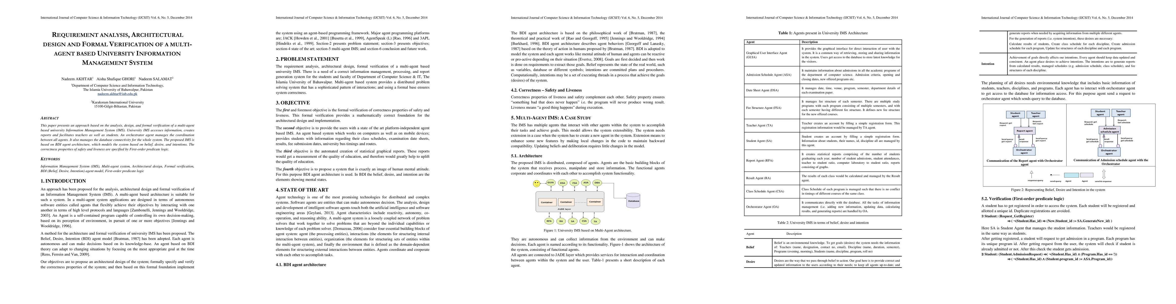 This paper presents an approach based on the analysis, design, and formal verification of a multi-agent based university Information Management System (IMS). University IMS accesses information, creates reports and facilitates teachers as well as students. An orchestrator agent manages the coordination between all agents. It also manages the database connectivity for the whole system. The proposed IMS is based on BDI agent architecture, which models the system based on belief, desire, and intentions. The correctness properties of safety and liveness are specified by First-order predicate logic.